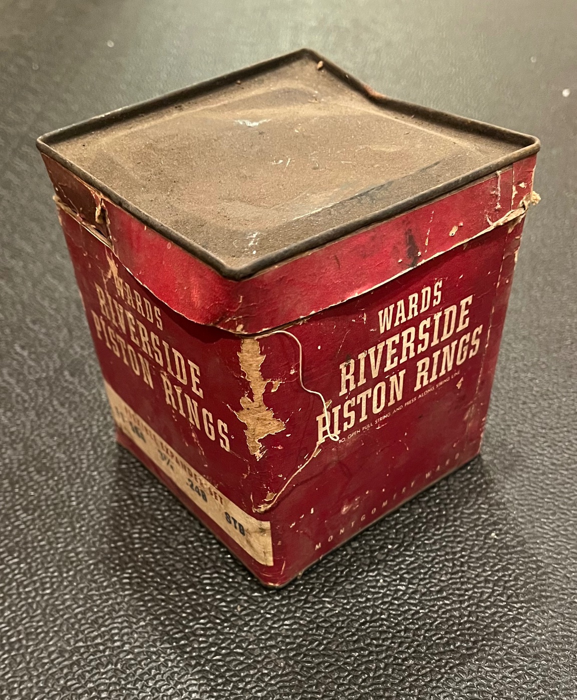 This is a really neat display piece. Original Wards Riverside Piston rings and box. The box is pretty beat up but displays well. There are rings inside on the box. Not sure if it’s a complete set. The original paper wrapping is very delicate so I didn’t pull them out. From what I can see, the rings are not useable. They are rusty from poor storage.