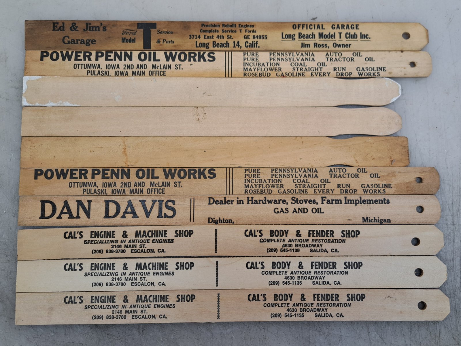 An assortment of ten gas tank measuring sticks. Price for the lot is $20.00 plus $8.50 domestic shipping. Mark Chaffin (951) 805-0928