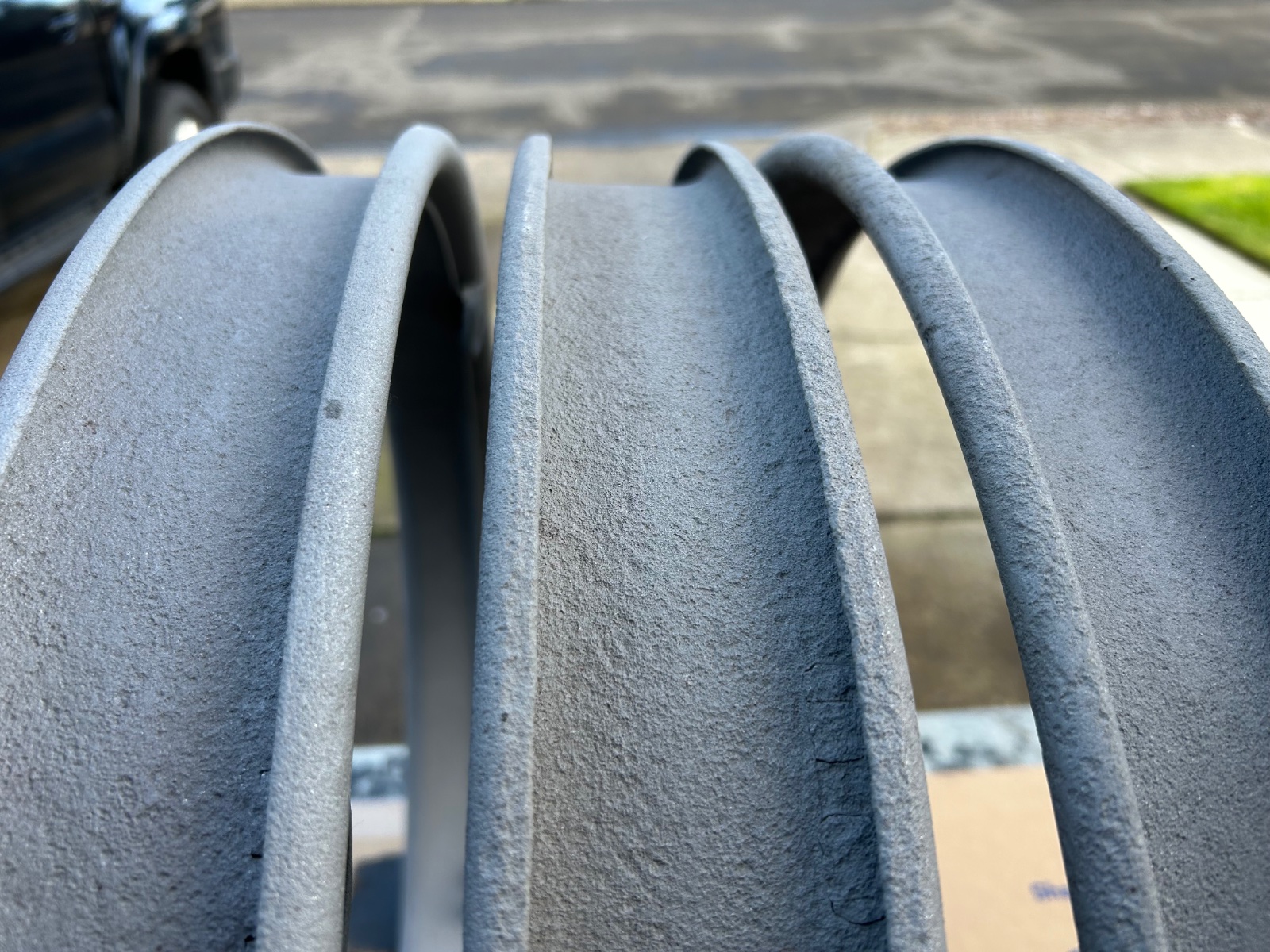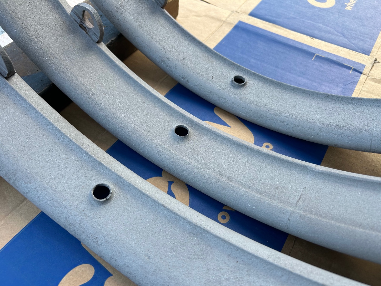 3 really nice demountable rims. These are not Hayes rims but have the fixed lugs, so I guess that makes them the Ford rims. Oddly enough 1 of the rims has Hayes lugs, but it is not a Hayes rim. I don’t know if the lugs are interchangeable between the 2 fixed lug type rims but all the lugs are tight on all the rims. These have been blasted clean.