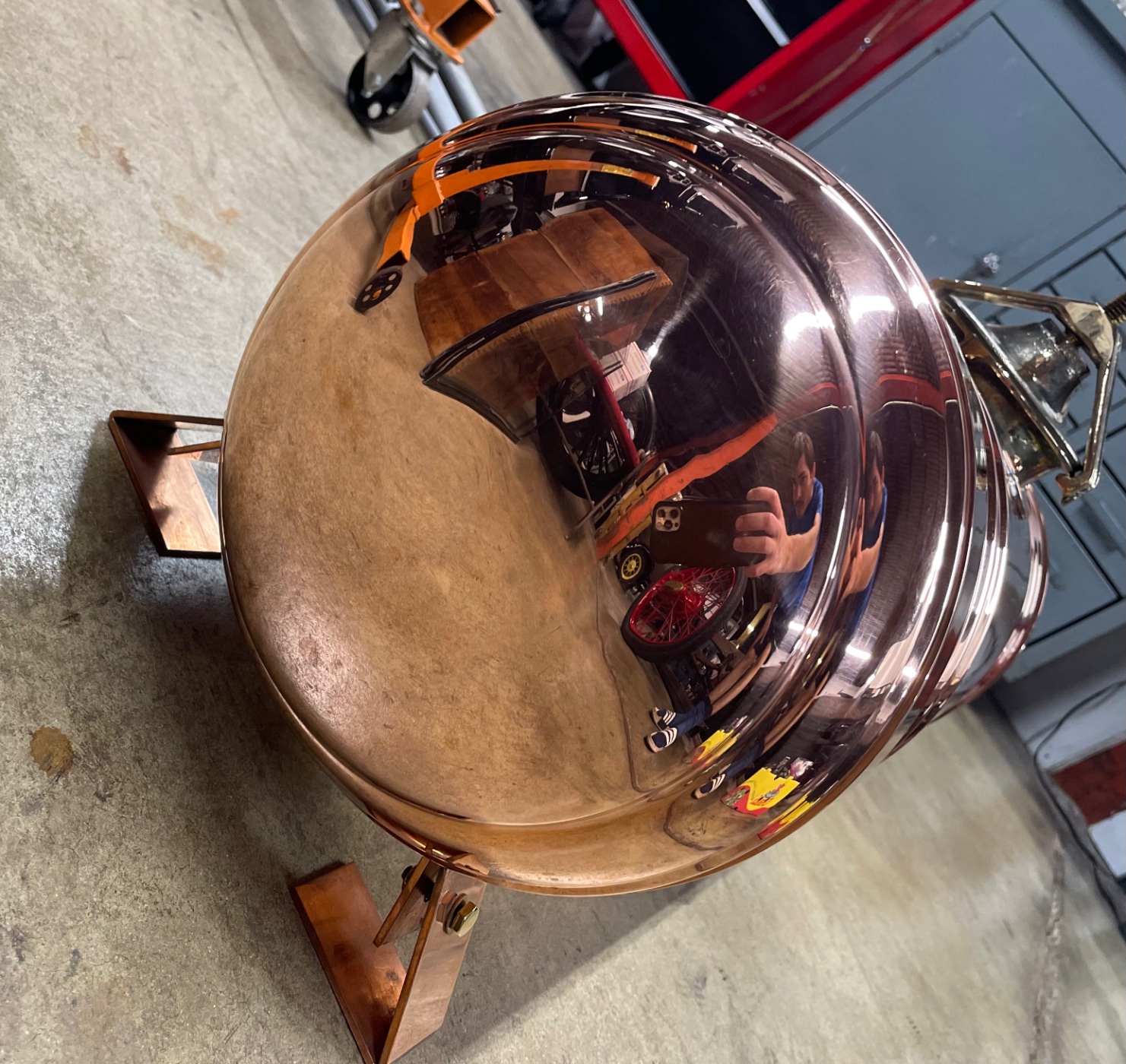 This is a brand new, CUSTOM made, solid copper gas tank from Brassworks, with the optional Mercer style filler cap. This is a very heavy built gas tank. Mounting straps can be moved inward of the tank beads. Beautiful piece. 8 Gallon.