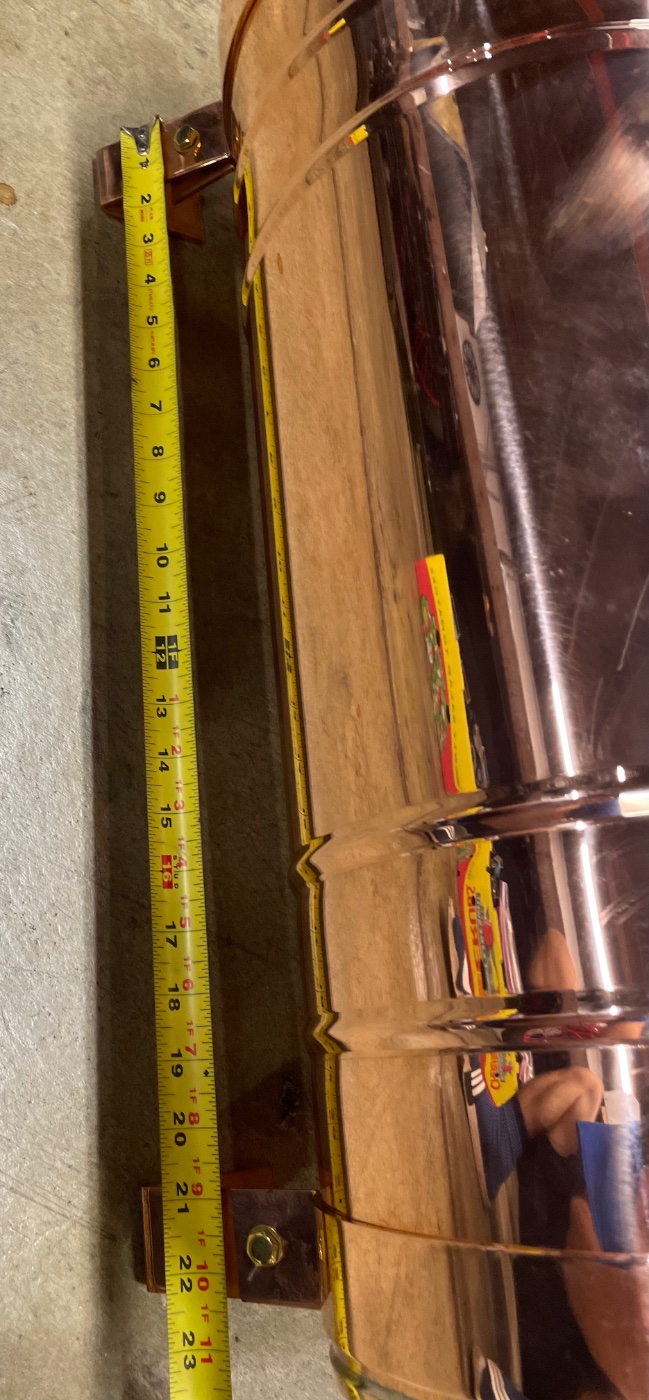 This is a brand new, CUSTOM made, solid copper gas tank from Brassworks, with the optional Mercer style filler cap. This is a very heavy built gas tank. Mounting straps can be moved inward of the tank beads. Beautiful piece. 8 Gallon.