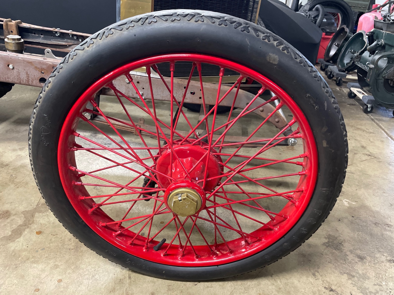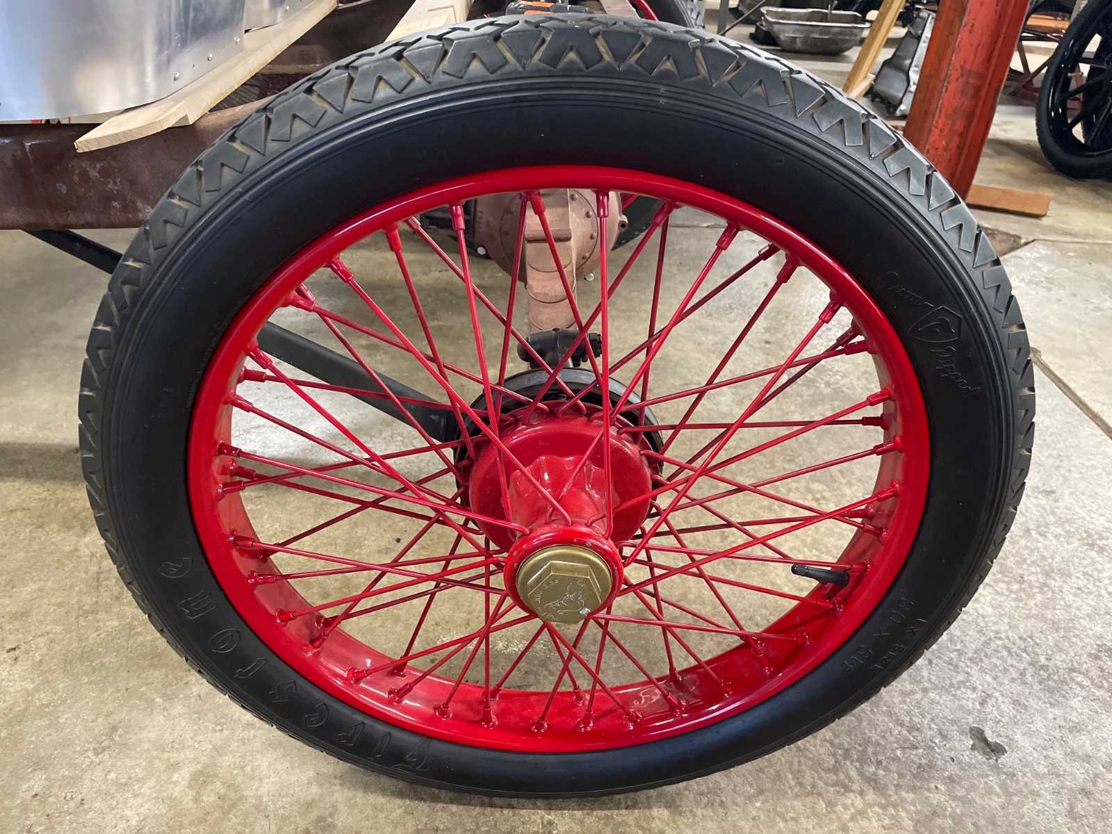 No pitting, no dents in rim, locking hubcaps are perfect. Hubs are exceptionally nice, threads perfect. Respoked at one time and Powdercoated in Vermilion red. Non-Skid tires are bald, Firestone Tires have half life left. New tubes all around.