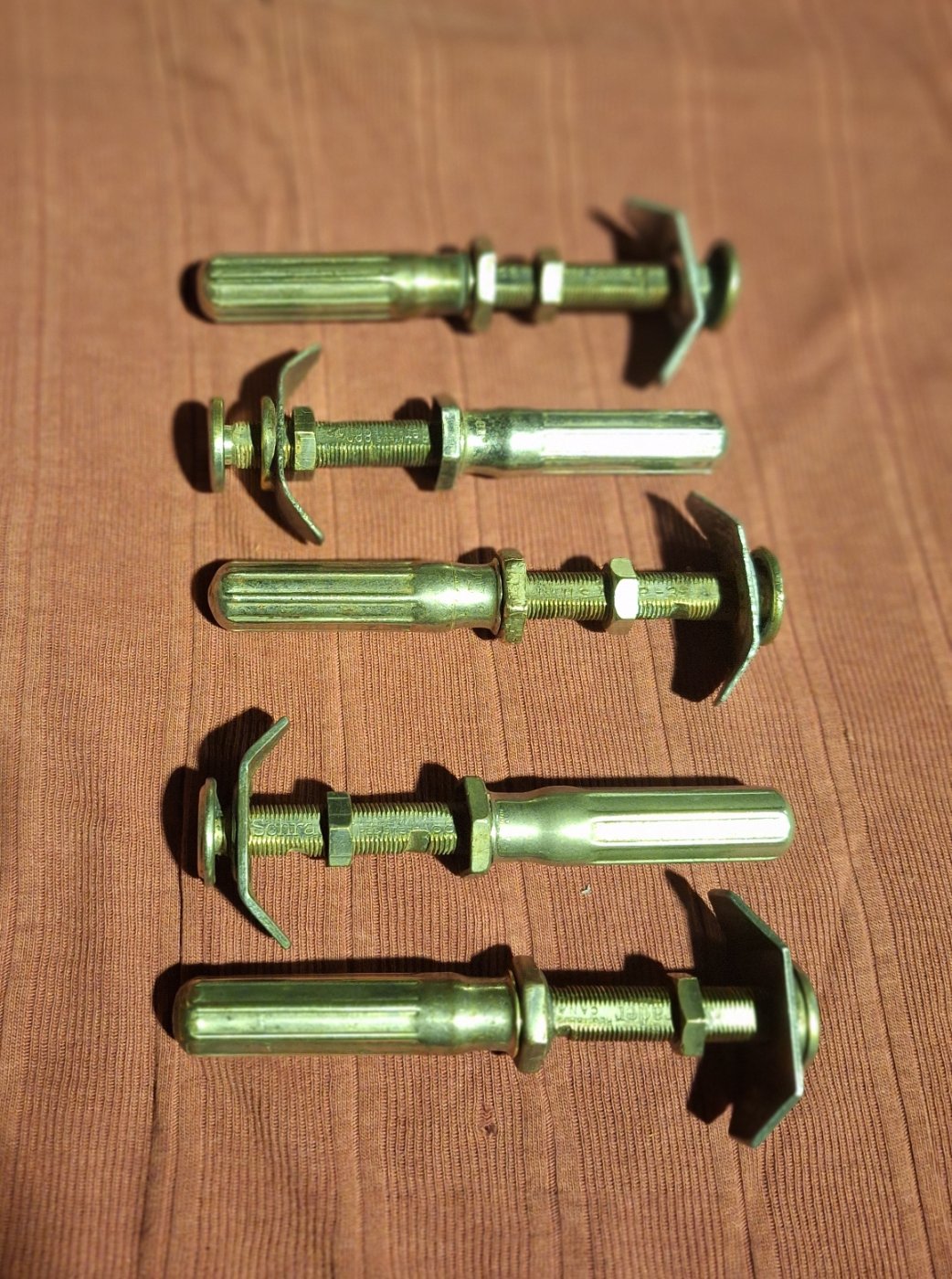 5 original Schraeder combos. All are the thinner model T size, 3 number 888s and two number 777s. Complete stems with correct bridge washers, stem nuts, dust cover nuts and dust covers. The two lower ones have inconsequential wear marks in the stem threads, as shown. $125 with tracked postage to your door. Paypal for payment