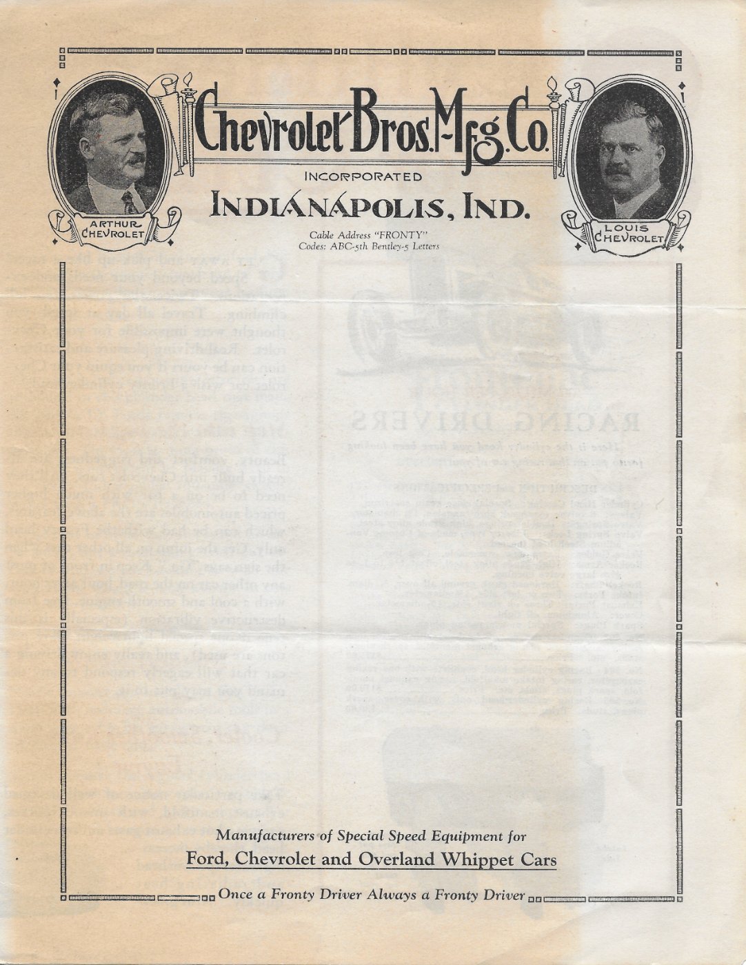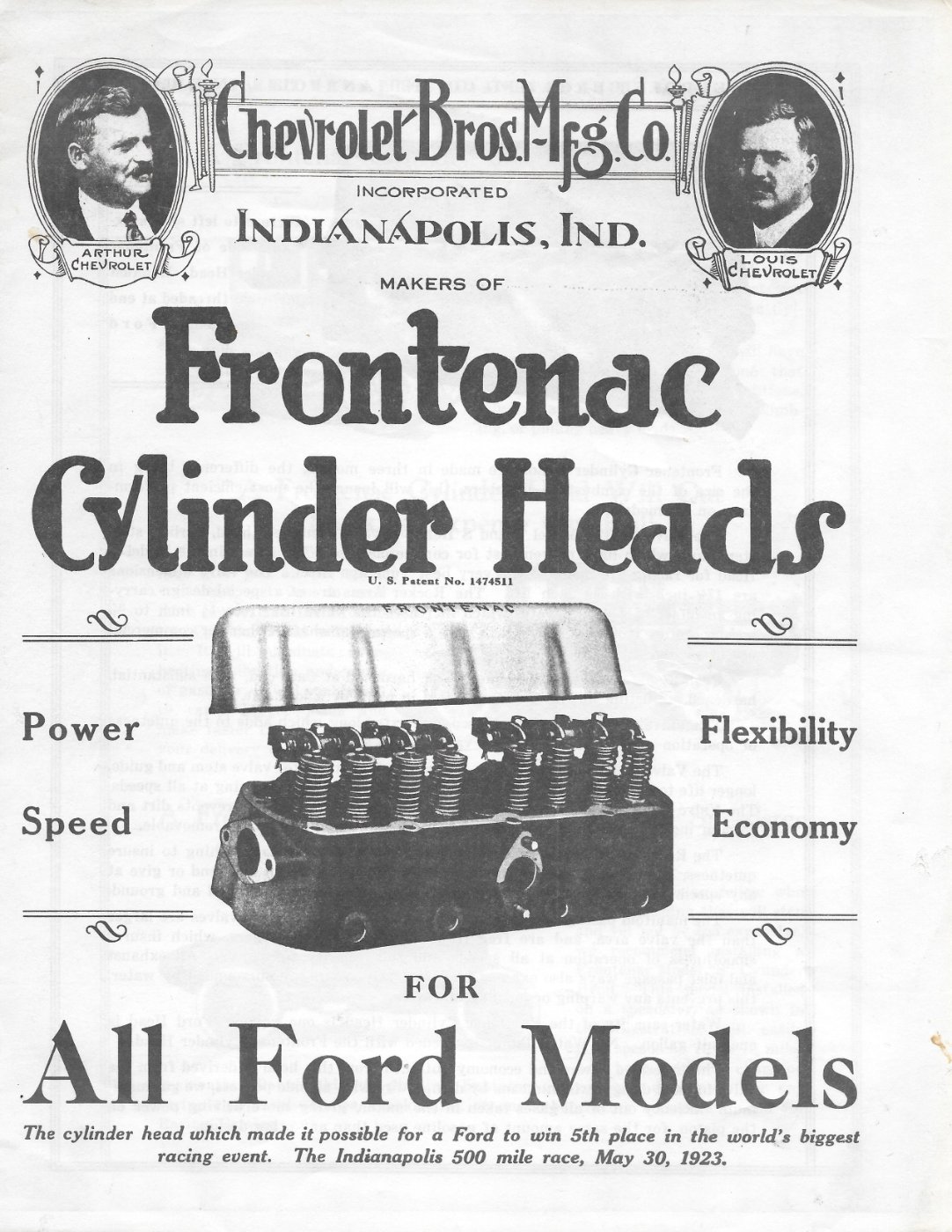 I have for sale what I believe to be three pieces of original Frontenac sales literature for sale. The first is a 12 page piece, dated April 1, 1924, showing pretty much everything Frontenac offered from cylinder heads to a complete race car. The second piece is four pages, has no date, but describes the T, S, and R model heads and has a picture of a 1923 and earlier suicide door coupe and a non-factory TT, suggesting to me a 1923 or earlier publication. The third piece, also four pages, offers racing components for Chevrolet automobiles. And, as with the Ford piece, has no publication date on it. I made an inquiry on the forum some time ago as to whether anyone has knowledge of these pieces ever having been reprinted and received no response. So, I'm listing them as being original based on that and on the discoloration of the paper, which is slightly more yellowed than my scanner will pick up, (and the fact that I'd like them to be originals). If any of you reading this has reason to believe that these are reprints, please do respond, both directly and on below on this post. I have a pdf file with all 20 pages that is too large to attach here which I will gladly email to you.. If you are interested, please email me through the forum (click on my handle "old_charley" over to the right and send it that way). I'd like $300 for the three pieces, shipping included. Thank you.
