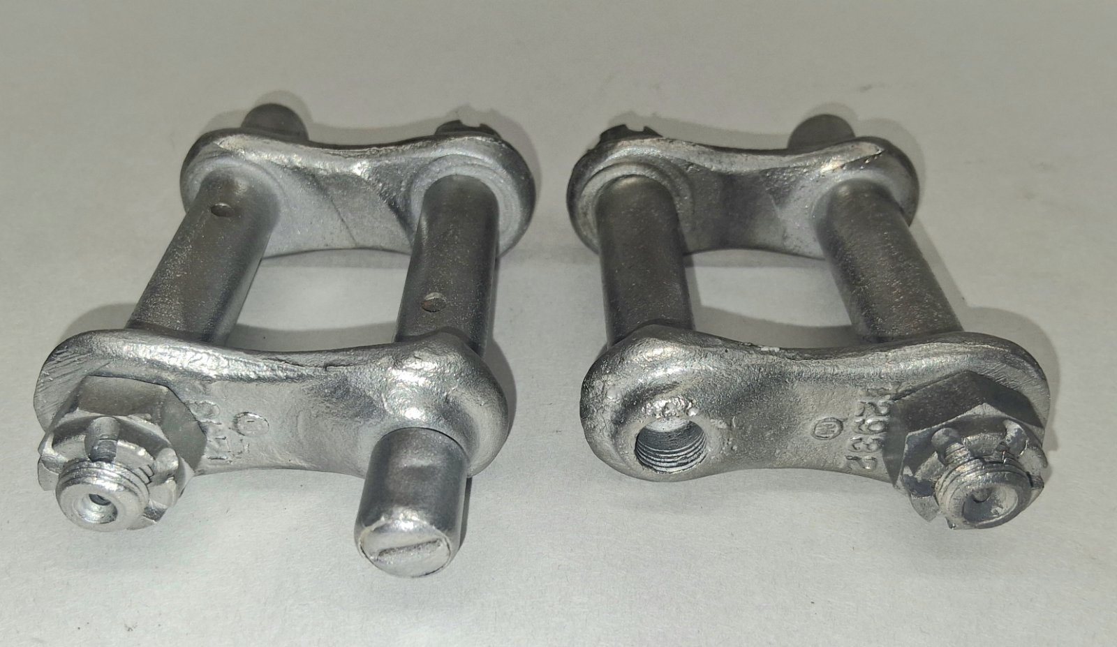 One pair of early figure eight rear shackles. Very minimal wear as shown in photos. Price is $75.00 plus $8.50 domestic shipping. Mark Chaffin (951)805-0928