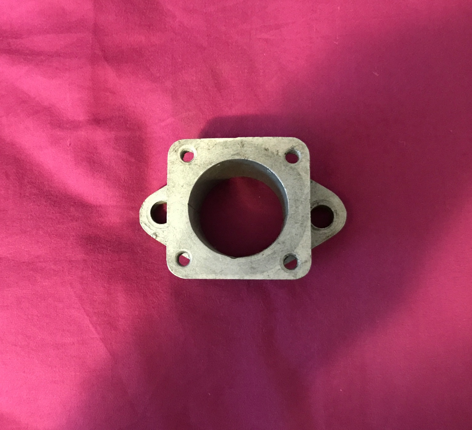 Original Winfield carburetor adaptor. Cast aluminum, with S-63 numbers cast into it. Has a threaded hole for fuel primer or brass plug. Measures 1-5/8 between center of holes on square mounting side. 2-11/16 between center of holes on manifold mounting side. 1-7/16 x 1-1/2 diameter taper in bore. 1-1/2 opening on square side. 75.00 includes shipping.