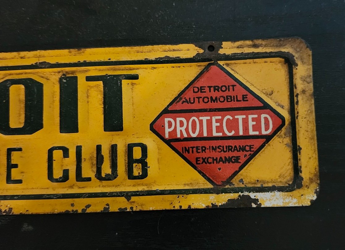 Sold to Phill! Thanks. Here is a really neat, original piece. This is an embossed sign that would be mounted on your car. 1915-1925ish. 13"x 3". "Detroit Automobile Club, AAA, Detroit Automobile Protected, Thieves Will Prosecuted". The price is 110.00 including FedEx Ground with insurance in the USA. I do not check messages here, so call me at 734-730-4274 or email me directly at motoringicons@hotmail.com
