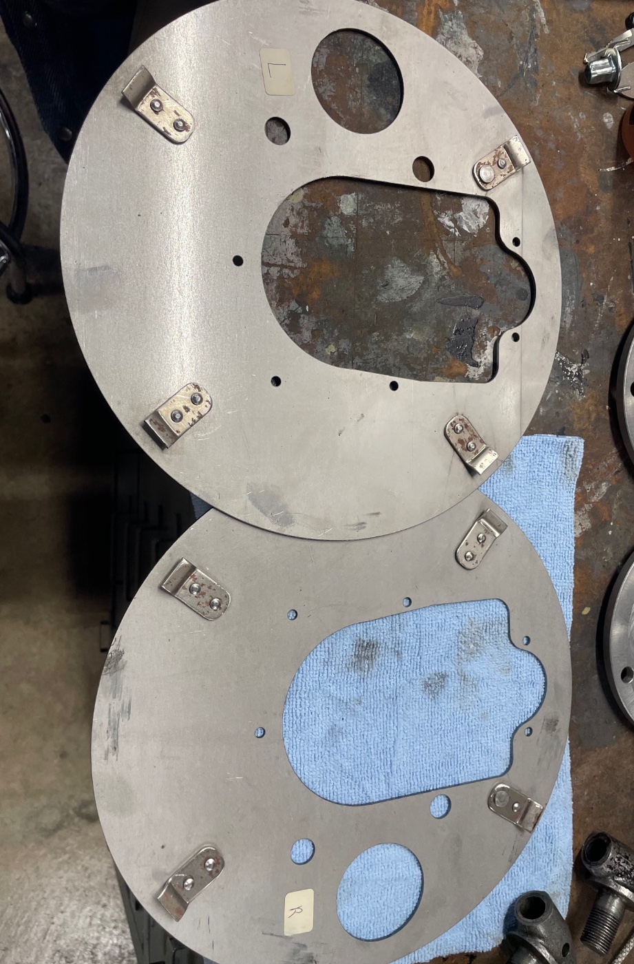 3) REPRODUCTION: Pair of backing plates, high quality, lazer cut with riveted tabs. $75