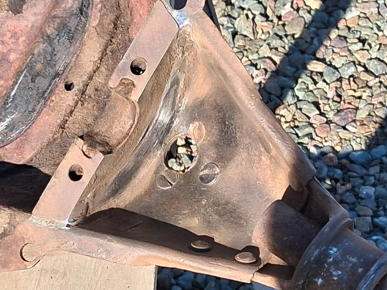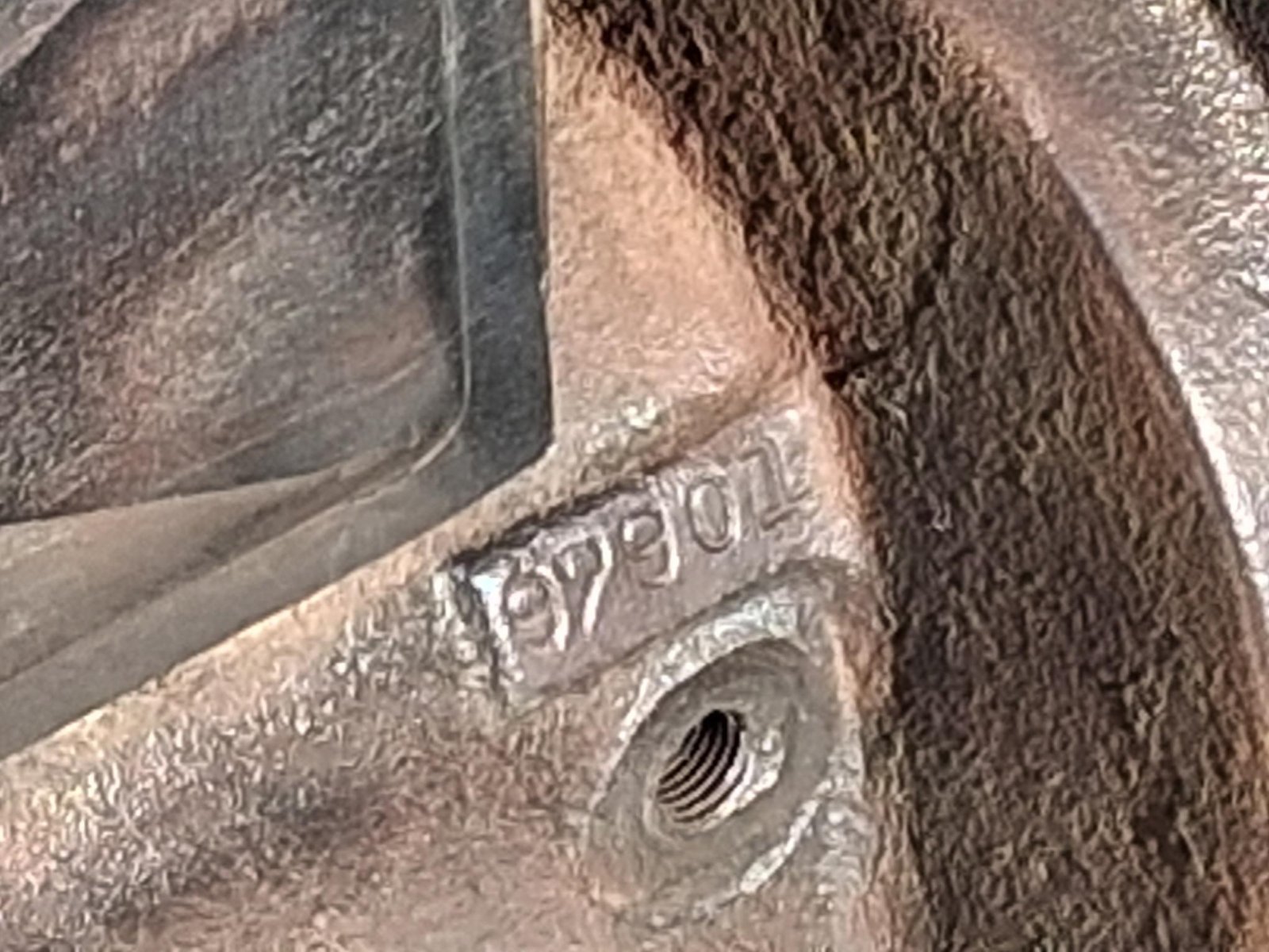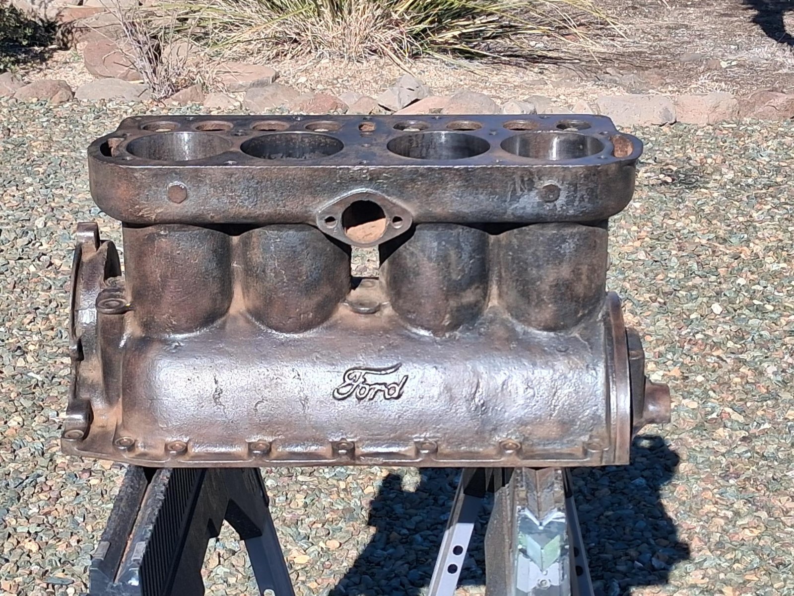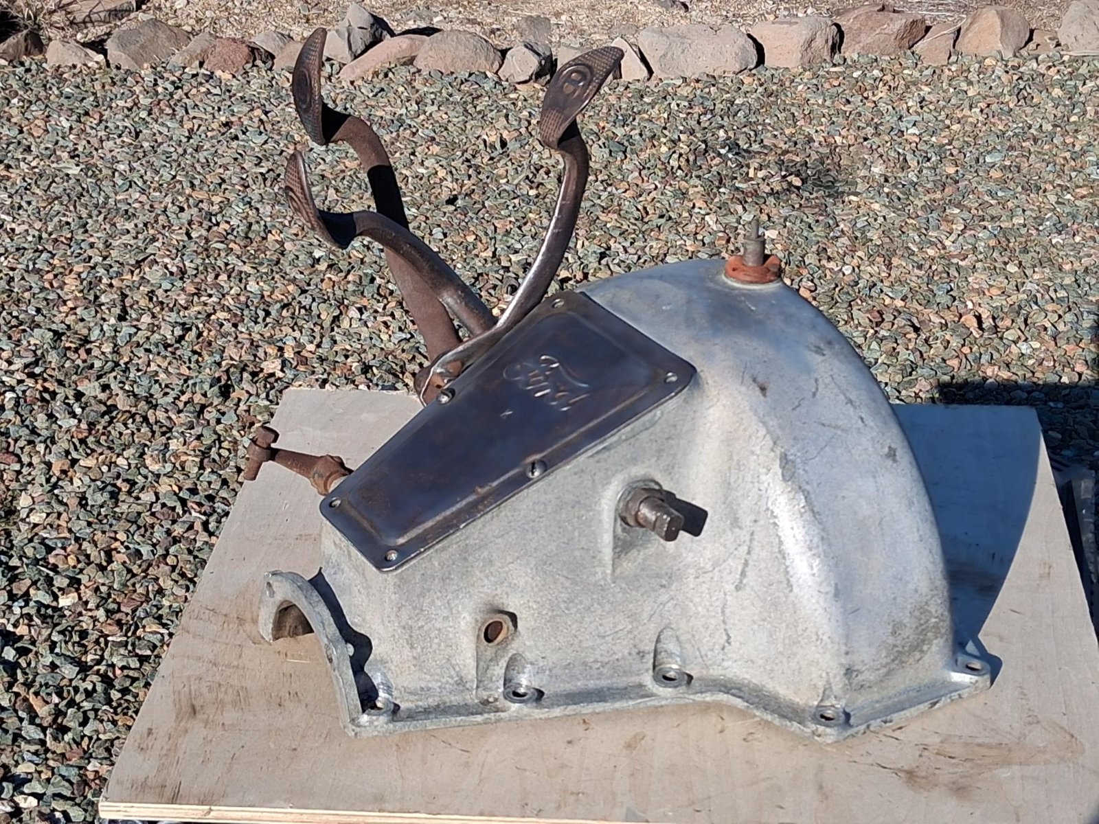 Everything in the first picture. Block with heavy valve doors, and timing gear cover; fan w/brass hub; seven rivet teacup pan; hogshead with pedals and Ford script inspection cover; complete transmission assembly. The block, going by the serial #97901 was assembled in March of '12. The casting date is not really legible. There are no cracks in the water jackets, but there is a chip in the pan mating flange on the left side that does not affect the mating surface. The cylinder bores have slight rust but no pitting and should clean up nicely. Several of the head bolt holes will need repairing and there is one bolt broken off at the block's surface. There is also some pitting on the block's deck in the combustion chamber area around the valves. There is no pitting on the head gasket surface. The hogshead is excellent with no cracks. It has the correct Ford script inspection cover. The pedals have a fair amount of wear to them. The pan is the correct seven rivet, teacup pan with tapered pan arms. It does have a crack in both of the block/hogshead corners that would be easily repaired. Also, three of the nose piece rivets have been replaced with flat head bolts and square nuts. The pan is solid with only surface rust. The fan blades are a bit banged up and will need to be flattened/straitened but don't have any cracks. The transmission is a complete assembly with flywheel and magnets. The drums have only slight surface rust and no pitting at all. The brake drum does have a little scoring from the band rivets. There is minimal wiggle in the triple gears or drums on their respective shafts.