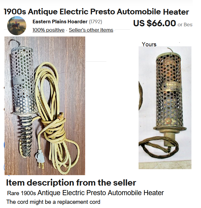 The eBay one being shown., as a hanger hook cord to plug it in. The other appears to be missing parts This is the description from WORTH POINT https://www.worthpoint.com/worthopedia/ ... 1900035241WorldChamp1914 wrote: ↑Fri Jan 30, 2026 6:04 pmFor my Presto Automobile Heater, it heats the intake manifold…My picture won’t upload.