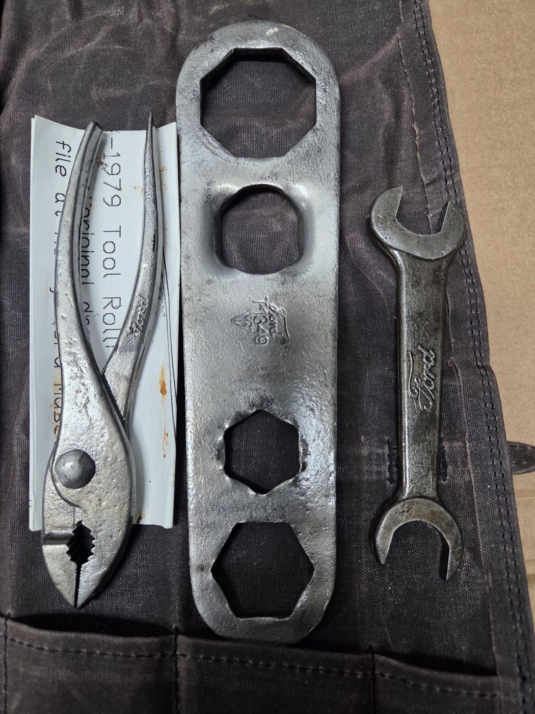 This kit is for a 1920 or later Ford Model T and includes all the original Ford Script tools! Here is what is included: T1349 Hub cap wrench, T1387 Adjustable wrench, T1903 Pliers, T1917 Double end wrench, T2335 Cylinder head wrench, T2336 Oil Cloth Tool Roll (reproduction), T2336 Tool Bag (reproduction), T2337 Oil Can (can has slightly bent oil stem and small hole in the bottom), (2) T2340 Tire irons. $150 with $20 for the post man. Email me at markpaulagember AT aol dot com