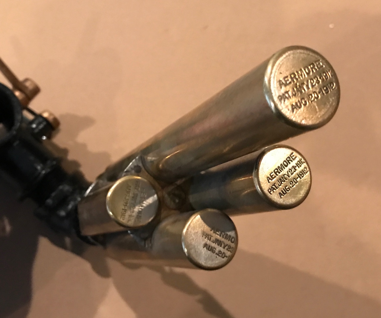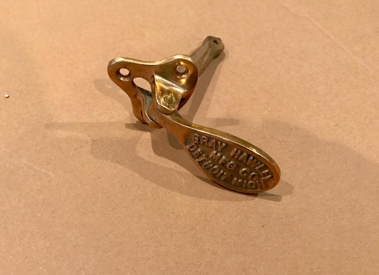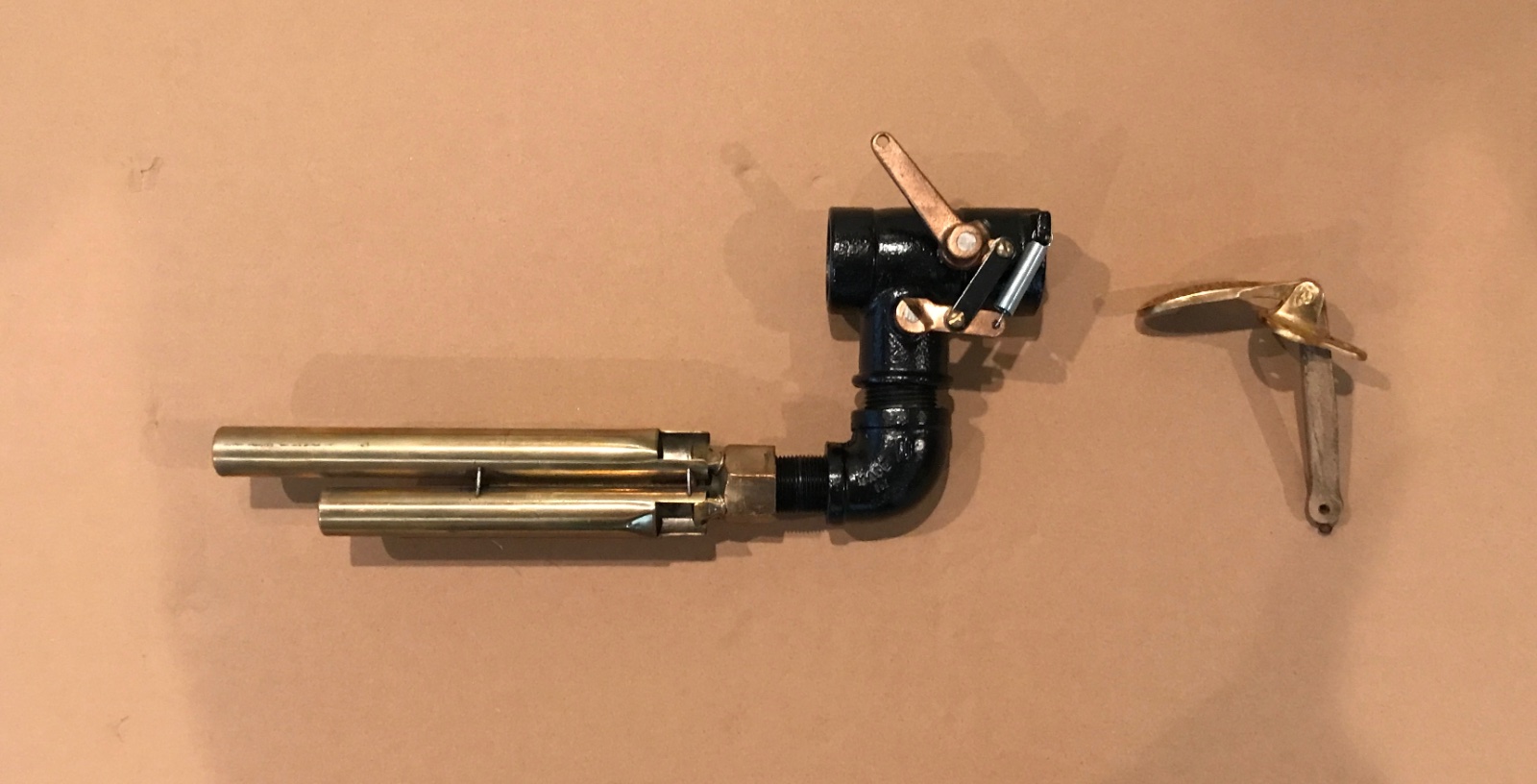 Here is a very rare 9 inch original Aermore exhaust whistle. Includes exhaust pipe butterfly adapter and brass foot pedal. This is a very rare Aermore whistle, seldom seen. Its smaller size allows for a shrill train whistle sound using the lower T compression even at slow speeds. The whistle is about 9 inches long, and 3/4 diameter flutes. The pipe adapter is 1-1/2 inlet and outlet. The whistle is in nice solid shape, a few small dings. The adapter is heavy cast iron with internal butterfly/diverter. The pedal is solid brass and very attractive. The whistle works as designed, loud and shrill. 425 includes shipping.