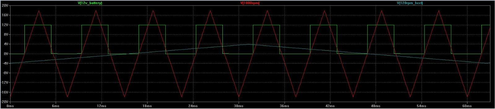 The HCCT briskly cranked at 2 revolutions per second (120 RPM) produces an AC output voltage pulse that rises abnormally slow to an abnormally low voltage level compared with magneto output operating at normal engine speed (1000 RPM). Here is a plot illustrating the 120 RPM HCCT magneto voltage output (blue trace) compared with magneto output at normal engine speed (red trace - 1000RPM) and 12V DC battery operation (green trace). Note that 12V DC powered electronic test equipment pulse (Green trace) more closely mimics the positive magneto output pulse at normal engine speeds (Red Trace) compared with the briskly cranked HCCT output (Blue trace). The HCCT positive AC pulse takes over 8 times as long to reach its peak value (4V) that is less than 1/3 the amplitude of the magneto output (>12V) at normal engine speed. In summary, just because the Model T magneto output produces an Alternating Current does not mean the coil test stimulus Must be an Alternating Current pulse. A fast Direct Current pulse can actually mimic the magneto output voltage at normal operating speeds better than an abnormally slow rising Alternating Current pulse with abnormally low peak voltage value.