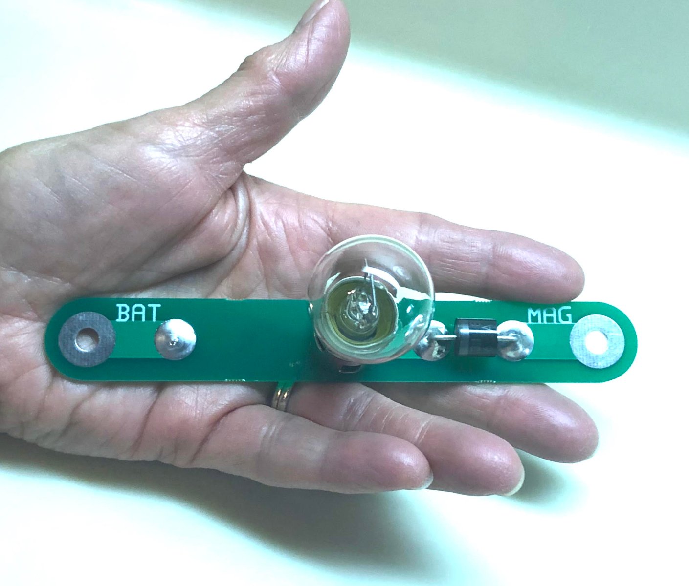 HSBC2.jpgThe bulb and the diode are in series so that part doesn't matter but you MUST make sure the diode is correctly installed since the cathode end (striped "banded" end) must point to the battery positive connection. The anode end of that diode must be pointed at the magneto connection. If you want to see a simpler version of this same device, I make them up with a printed circuit board and all parts mounted such that you only have to slip the thing onto the 2 ends of the coil box connections at the bottom. These are the Magneto (MAG) and Battery (BAT) connections that are the bottom 2 connections of the 10 connections on the engine side of the coil box. I will attempt to attach a picture of the device all built and ready to install. You can put it on or take it off in a few minutes with no wiring alterations other than removing the outer thumb nut on each side, then slide the Printed Wiring Board in place and reinstall the thumb nuts. If there is no picture posted here then send me an email or PM and I will send you a picture of the device.