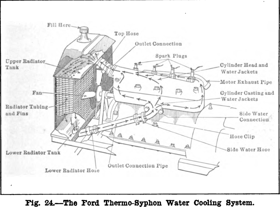 I have 2 26's and both have license plates on the headlight bar. They both have high heads and no water pumps. Both have Brassworks radiators. I live on a mountain and it is uphill for 15 miles to our town then the last mile toward our house is a low gear or low Ruckstell hill. On a hot day, I pull the hill and the Motometer does not go over "normal summer temperature". When I turn off the engine, it gurgles for a few seconds. It does not steam or pour water out of the overflow. I use 50-50 antifreeze coolant. I fill to the level of the Ford on the front of the radiator shell. If you overfill, it might put out some water when it gurgles but should stop overflowing when it is about 2 inches below the top of the radiator. Do not add water unless it is below the Ford emblem. Just check to be sure it is about half way up the top tank. Wiggle the car a bit to be sure what you see is actually water and not just a wet baffle in the top tank. When I got one of the cars I had a water pump on it. It actually ran too cold and on a cold day the engine would not warm up with the pump. I took it off and the car runs fine just as Henry intended. Same thing with my 22 except it has a low radiator and the license is mounted below the radiator.