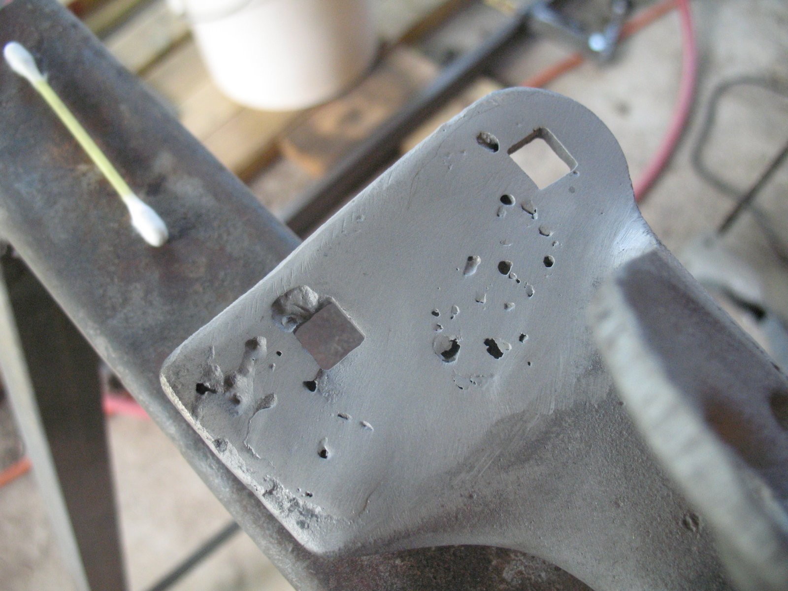 Earlier I repaired these rounded-out carriage bolt holes, and today's job was to fill the little craters around them.