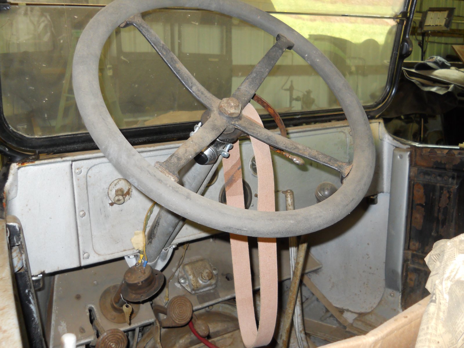 I have my engine and trans sorted out and even drove down the lane and back. Currently I am working on the top bows. The bent wood bows need shaped to fit inside the metal bows and be cut to the length needed for the correct overall shape. Here is a picture of the bows wired together at the correct hieght and shape with the exception of the front bow that needs to be shorter to be closer to the windshield. Art