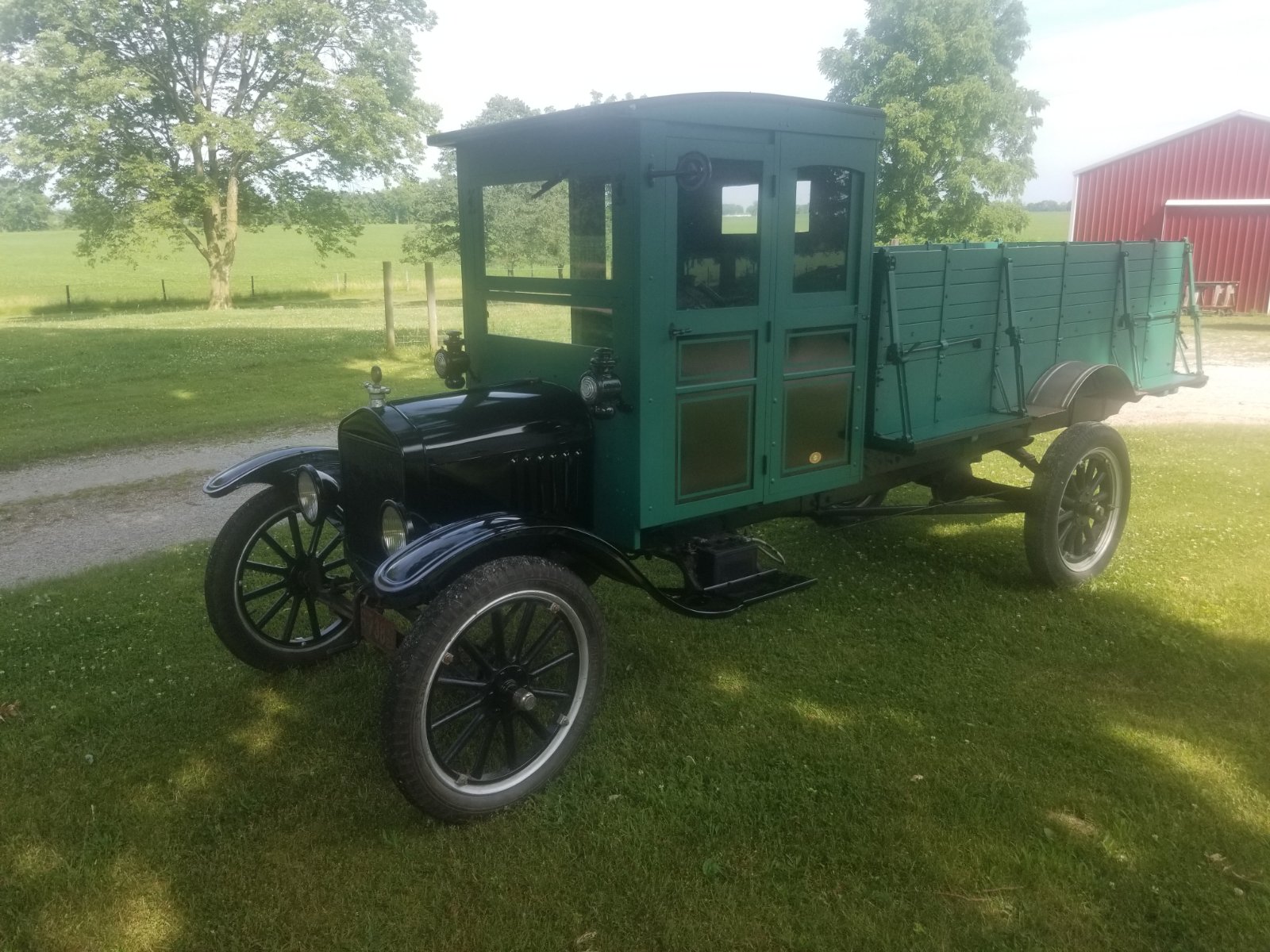 Covid19 "lockdown " has been spent changing the colour from a garish red and white to a more sombre green but, the wheels remain red. There have been many other jobs to do as old vehicles often have. Today however was a special day. I have found out that it was registered to use on the highway for the first time 99 years ago 29th of June 1921.The old girl didn't let me down!