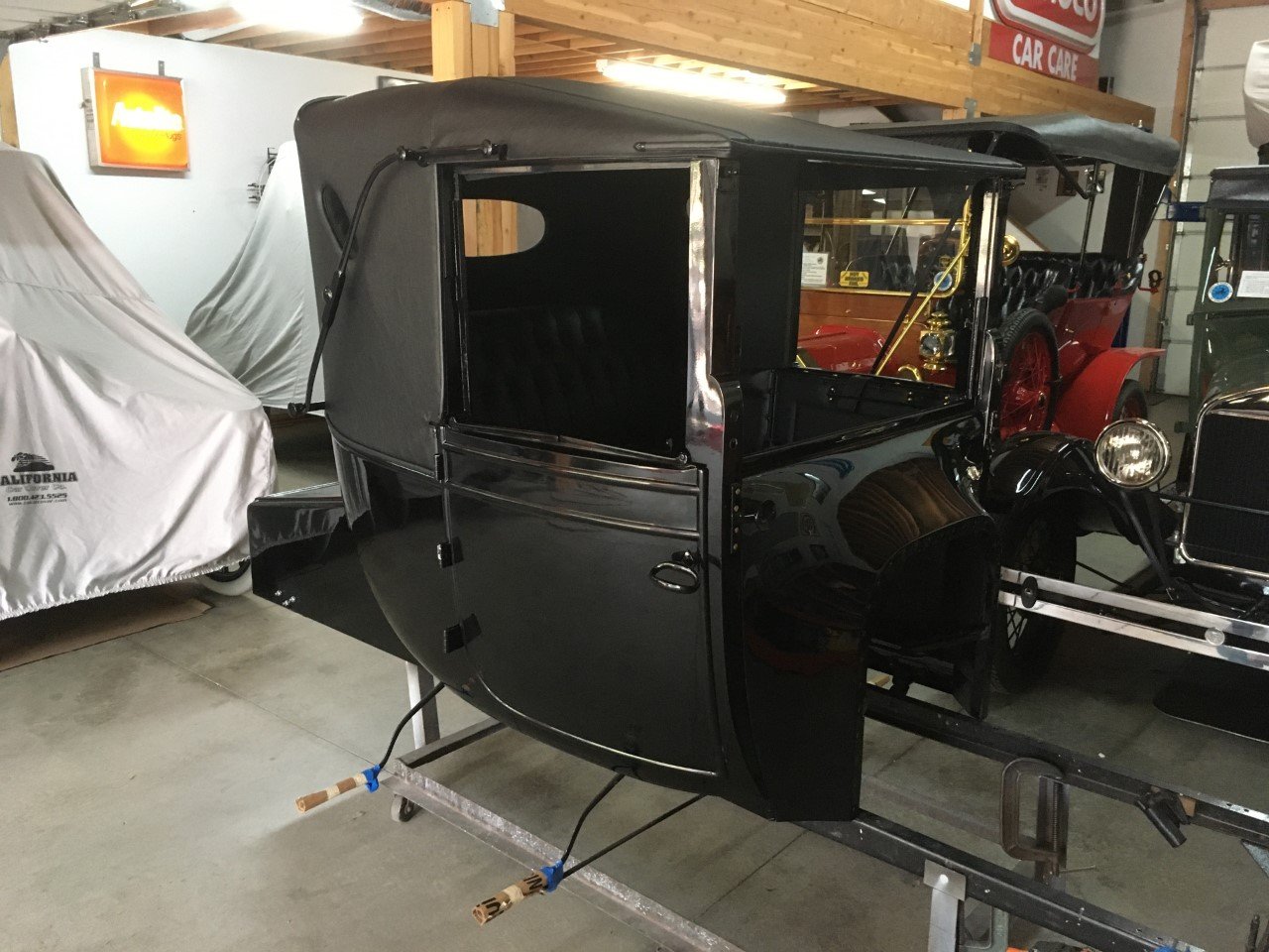 It's time to move along with another restoration, and this 1916 Coupelet is my latest project. The car was purchased by Mike Walker, who had worked on the chassis, but did not get the body completed when I purchased the car from him. I had Ray Wells re-wood the body and had my good friend massage the body panels and paint the car in Limco "Ultra Black" single stage urethane. The upholstery and top were completed by Ernie Romero of El Cajon, CA. The engine was rebuilt by Jim Blair of Tucson, AZ and I completed the assembly and restoration of the engine assembly. The engine, with a casting date of 12-27-15 and SN: 1025XXX, determine that the car was completed on December 30, 1915. Interestingly, I have an original photo of a new 1916 Coupelet at the factory with black and brass trimmed side and head lamps, and I have a set of these lamps I may use. I have completed the front and rear end rebuilds and the frame is also ready to paint. Here are a few photos of the Coupelet: