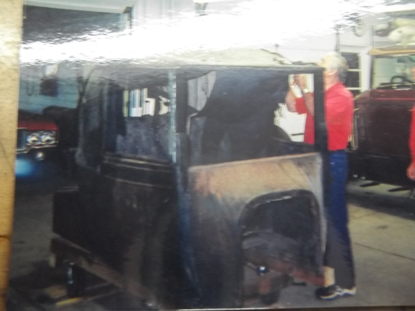 Here is the original photo of the coupelet with brass trimmed lamps and the coupelet body, as found, being initially disassembled. As I make additional progress, I'll add photos. BTW, the 1916 coupelet is a huge improvement over the 1915 coupelet with the small side windows, larger rear window and the trunk lid on the top of the trunk. Also, the 1916 car had a dark green headliner rather than the blue liner on the 1915.