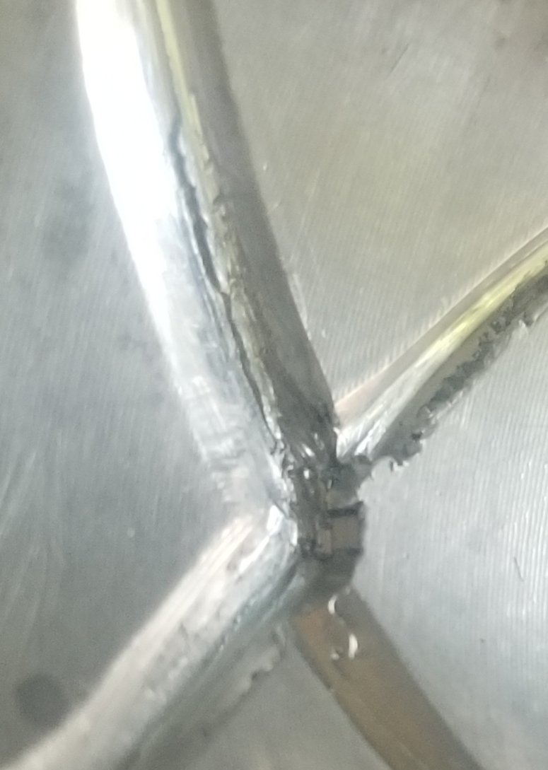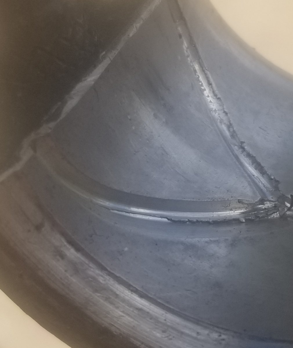 Blow the photo up to full screen size and you will see 3 cracks, the major one is up the oil groove closest and another one on the other oil groove and also one running around the radius.