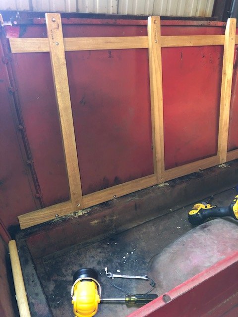 Lower edge of card board behind clips. Front edge doesn't need any support as the board curves with flexing to give strength. Only the door edge side is retained by nails into the wood tack strip that is placed in the hinge metal channel. Accessory check strap added under the cardboard, factory didn't place check straps in the Improved open cars.
