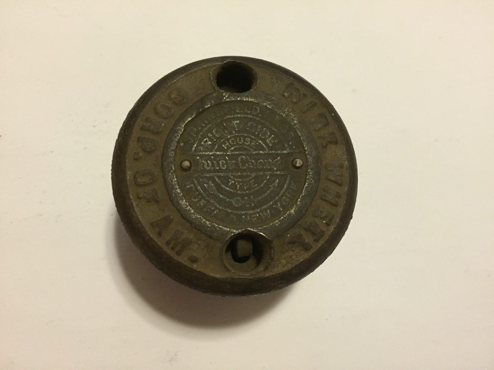 The pin drive caps are a typical earlier design for the Buffalo/House wire wheels. They were replaced sometime about ‘22. There were both cast iron and brass variations of these pin drive caps, and each had their own medallion design
