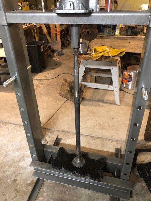I think I am going to have to punt to a shop. I put it on the arbor on the thick metal plate on a 1.5 inch socket which made it just about 1/2 inch too long to fit into the press. I took out the movable shelf, put 2 x 4 wood across the legs with the metal plate on top and pressed some, the wood creaked. It did not move the gear. Tales of axles shooting out to spear me through my brain spooked me so I stopped.