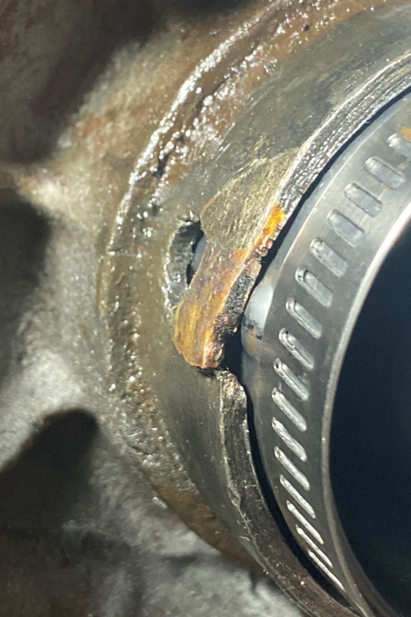 Well, I decided not to let a sleeping dog lie (idiot!!!). I had a minor grease leak from the rear passenger outer seal and decided it needed to be addressed (can you hear the can of worms opening yet??? 😊). I had all the parts I need so I pull everything out. That’s when I discovered this little gem (note the braised repair to the torn metal near the dimple hole)…