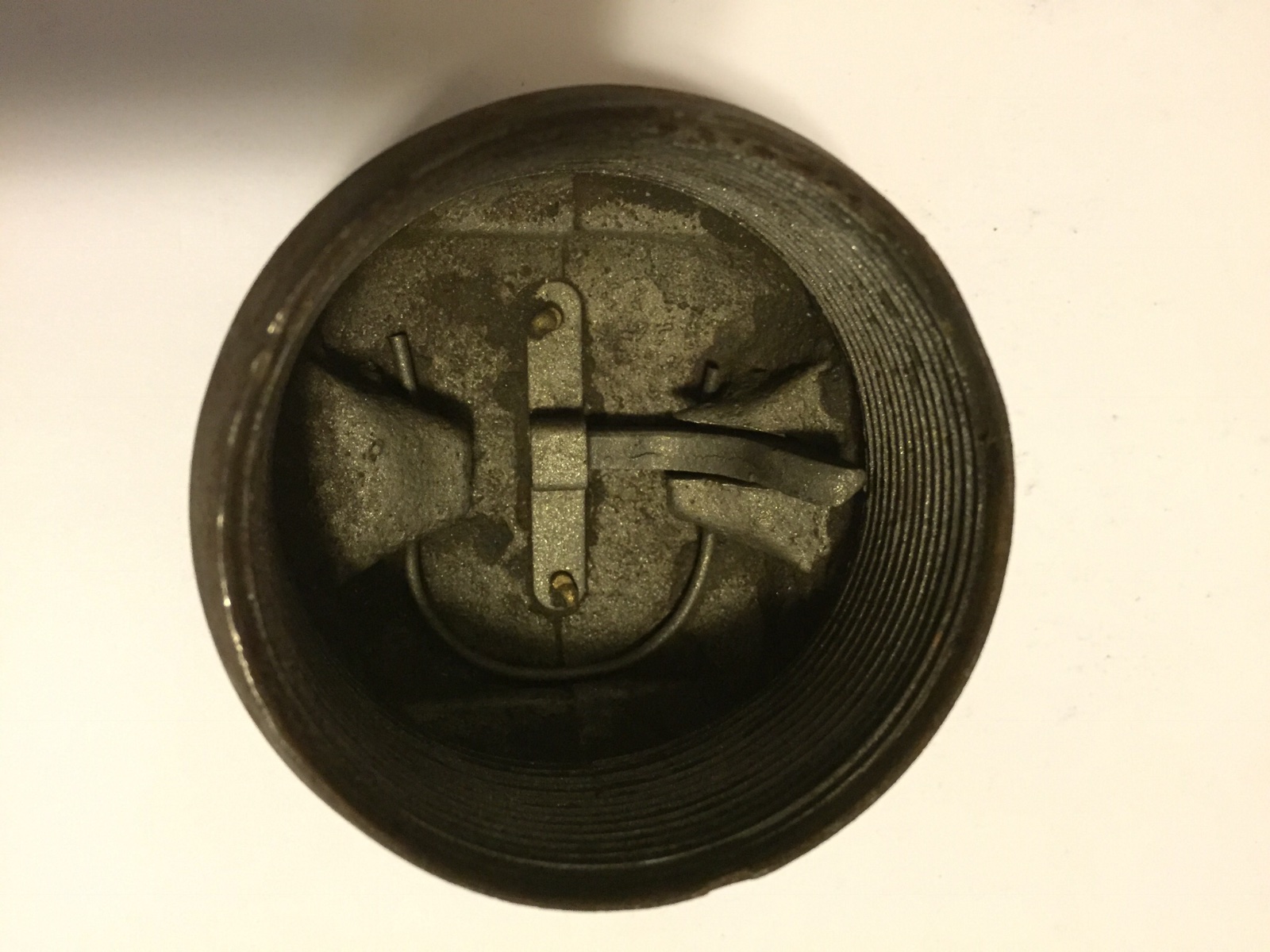 There is a sight recess near the outer perimeter of your caps to accept the thin sheet metal medallion. If the brass caps are similar design to the iron caps (I don’t have any brass caps to confirm), the medallion should be held on by the same 2 rivets that capture the latching mechanism.
