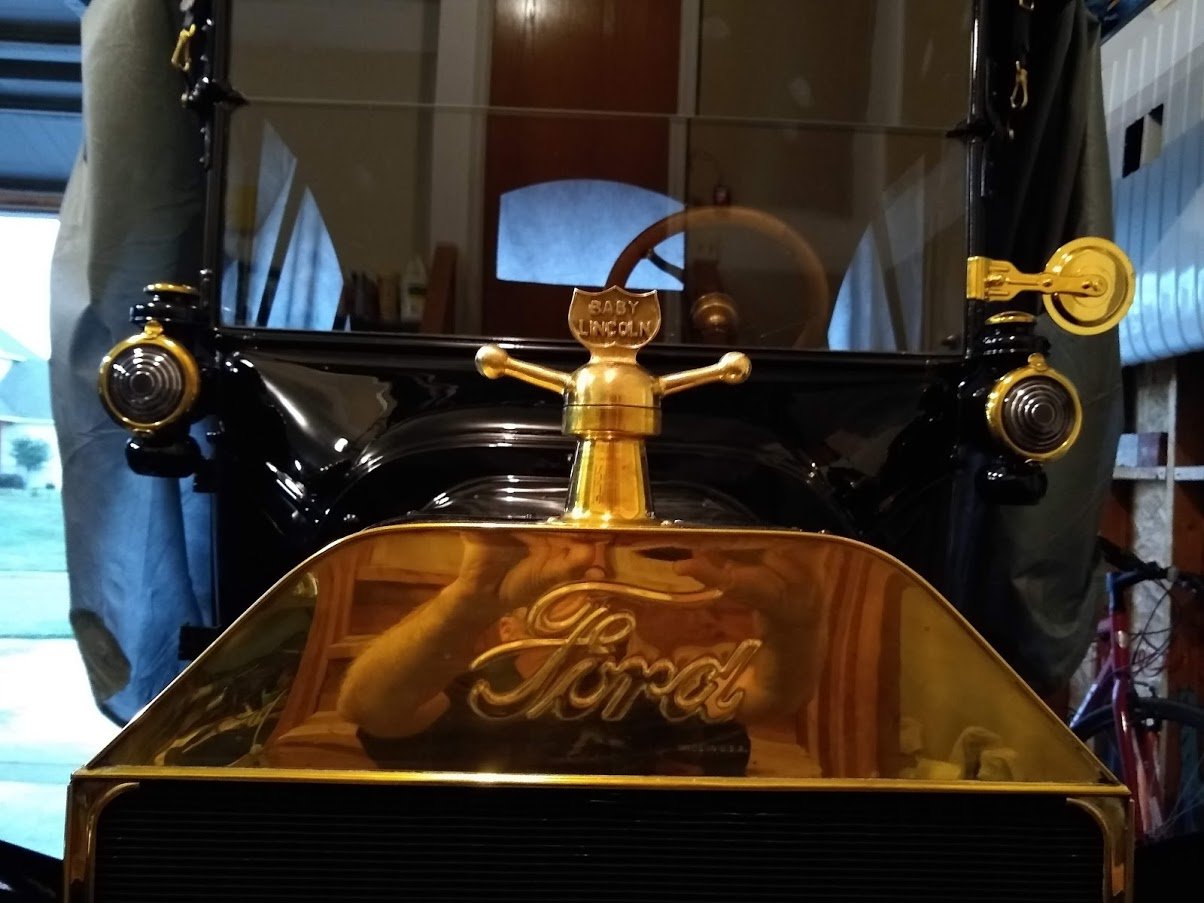 Yesterday was my wife and my wedding anniversary, but I still had time to slip out to the garage and check fit my brass baby Lincoln radiator cap on our 15 runabout. Looks good, and I think that the joke makes the most sense on a runabout!