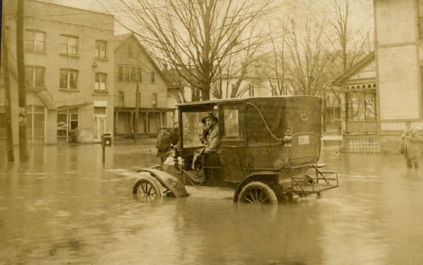 And it’s still raining. Looks like he’s wearing a seafaring man’s wet weather gear. Good idea. The T can handle that much water, but if it gets high enough to touch the fan, the spray will likely short out the ignition. Any idea of where and when ? A remarkable body in the T. Is it custom ? What year is the T ?