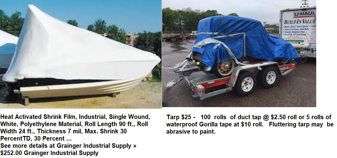 If you cover the car with anything, be VERY careful with what you use to wrap, and how tight you wrap it. I wrapped a car many years ago, the tarp vibrated in the wind all the way and beat the hell out of the car's paint. Worst part was a hook from a bungee cord the continually beat on the edge of a fender. Made a 2" diameter patch the looked sandblasted and beat by a hammer. I like the stretch wrap idea!