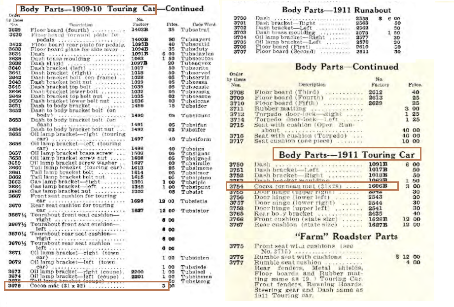 Cocoa mat part 3676 is noted for the 1909-10 Touring