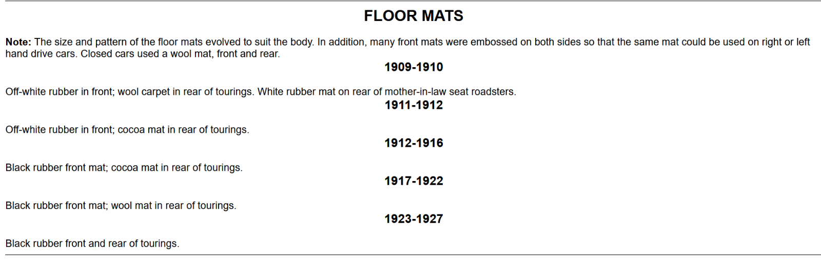 Just updated the chronology in my post above - cocoa mats from 1911 to mid 1917, wool felt to 1921 or 22, rubber afterwards, all for touring cars.