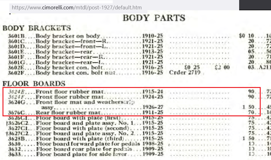 My guess would be the Tourabout used the Roadster w/ Mother Law rear mat, p/n 4409 Factory # 1665, "Floor Mat, Rear Roadster, 30 3/8" x 30"BRENT in 10-uh-C wrote: ↑Wed May 29, 2024 11:40 amCan I bring this thread back from the "depths" to ask a question as it pertains to a Tourabout? Would the factory-assembled Tourabouts have been furnished with a White Rubber Mat, -or would it have had a special sized Cocoa Mat (-i.e.: 30½"w X 21¾"l)?