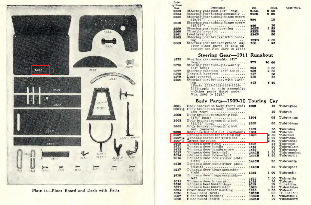April 1914 List: '09-'10 p/n 3607 is listed as "Tonneau (sic rear) carpet for Touring Car" 33 1/4" x 32 3/8" with Factory Number 1606A