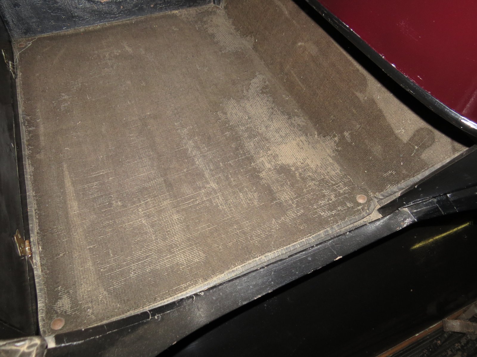 Without question the earliest cars had a carpet in the back. I have worked on a few 1909 cars and the button snap posts are usually still in place on the floorboards. I have the factory blueprint for the carpet in my files somewhere but it doesnt have much detail. The one shown here is one of few remaining examples. Hope it can be studied in detail.