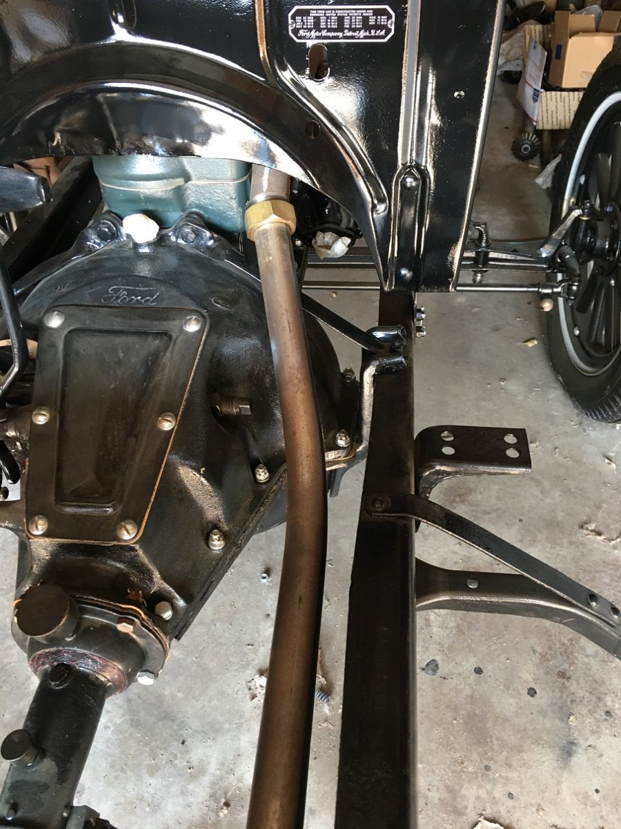 I installed the exhaust pipe and muffler on my 1926 TT chassis. The exhaust pipe is one of Larry Smith's fine reproductions and the muffler ends are originals. The two outer shell pieces are from a reproduction muffler while the inner shell is part of the exhaust pipe. The fit was great, making for an easy assembly and installation.