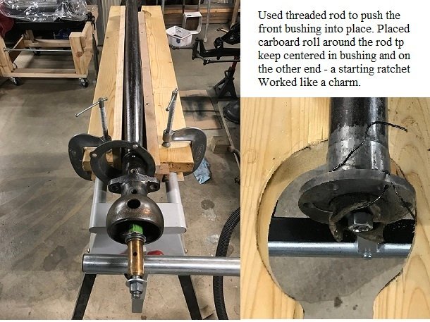 Thanks for the tip I did it exactly like that and it went in what I think is pretty well. Here is a picture. I cranked it down until it really resisted and stopped so I think it is all the way in? You can see the hole to peen the universal joint rivet in the second picture. The threaded rod I bought from Lowes was a bit expensive maybe because I bought a big thick one. I am not sure what I will do with a slightly used 5 foot threaded rod that I might use once in 10 years. The nut was large enough to push the bushing without a washer and did not hit the edge of the recess.