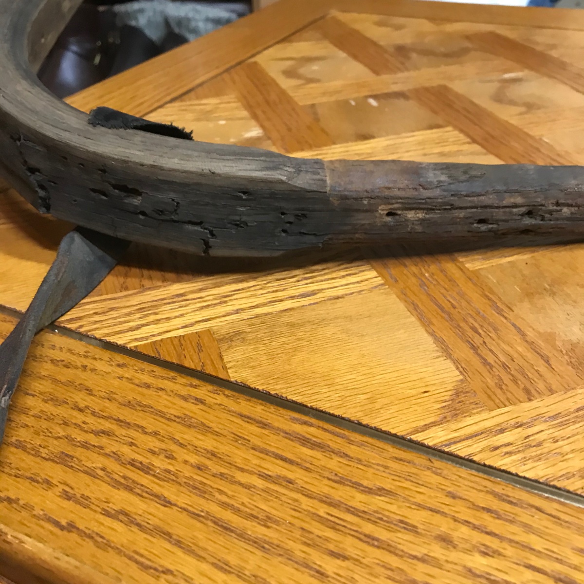 The curved part of the bow shows cracking.