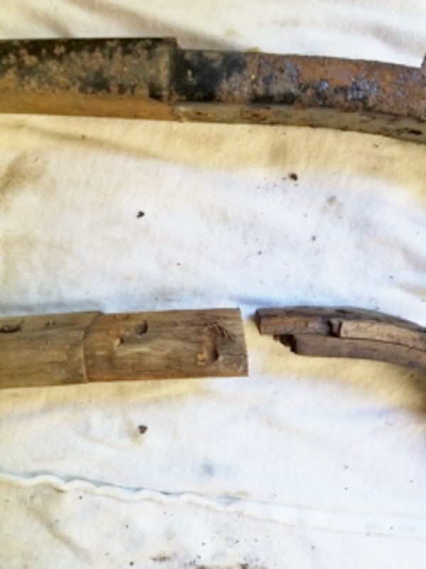 Original bow and the curved wood pieces removed from top iron. The curved side wood pieces stack on each other and fill the rectangular top iron cavity.