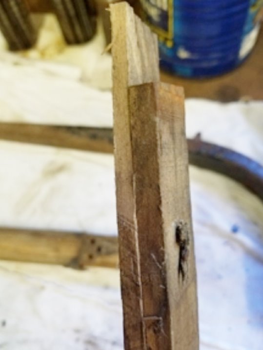 Those irons are the backbone of the top covering. Originally the wood was snug and tight in the corners and the wood bow riveted in the socket.