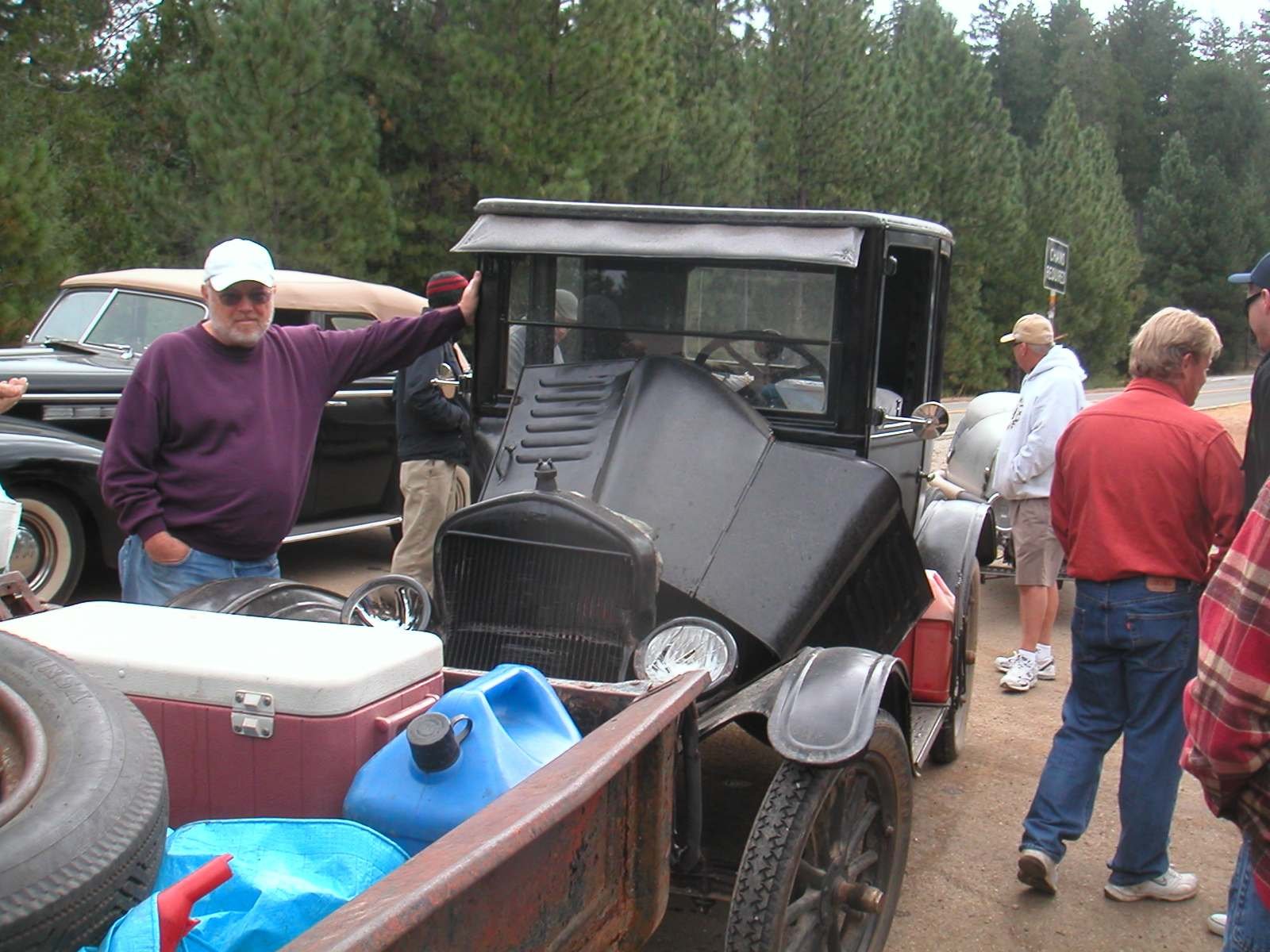 Lee had broken off his shifter casting on the Ruckstell and was the second car in line on the tour. He had stock transmission brake and I think, unlined parking brake, no auxilliary brakes. He planted his T dead center on my pickup bed... so perfectly that he lost the radiator and headlights but NOT A SCRATCH on either fender and the hood popped off. Here we are ten years later and Lee Still thinks I saved his life (I didn't, it was all Rusty!).
