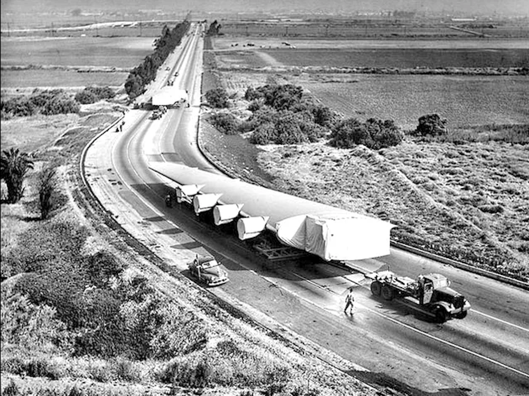I was almost five when I saw part of the plane. It was being transported in sections from the Hughes plant near Playa del Rey to Long Beach for assembly in the harbor. The driver of the truck hauling one of the wings parked by our house on PCH while he went into the cafe next door for a cup of coffee, so the wing was about twenty feet from my bedroom. A crowd of neighbors gathered to check it out and my friend Scott Shell, who was a year older, informed me that it was part of the biggest plane in the world.