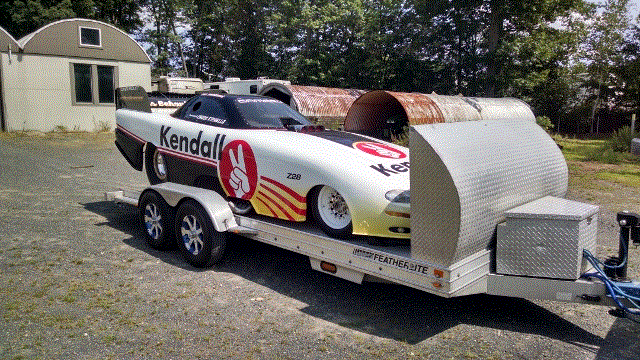 The enclosed trailer is an aluminum Ameri-Lite 24foot trailer that is an actual vehicle trailer, NOT a cargo trailer. It has a beaver tail rear & a drive in rear door making loading of the lowest vehicles no problem at all. It is fully finished inside with electricity, compressed air, RaceDeck flooring & is insulated. I don't have junk hanging off the walls that might fall on your car & I don't pile a bunch of parts in the trailer. Your vehicle is the most important thing!