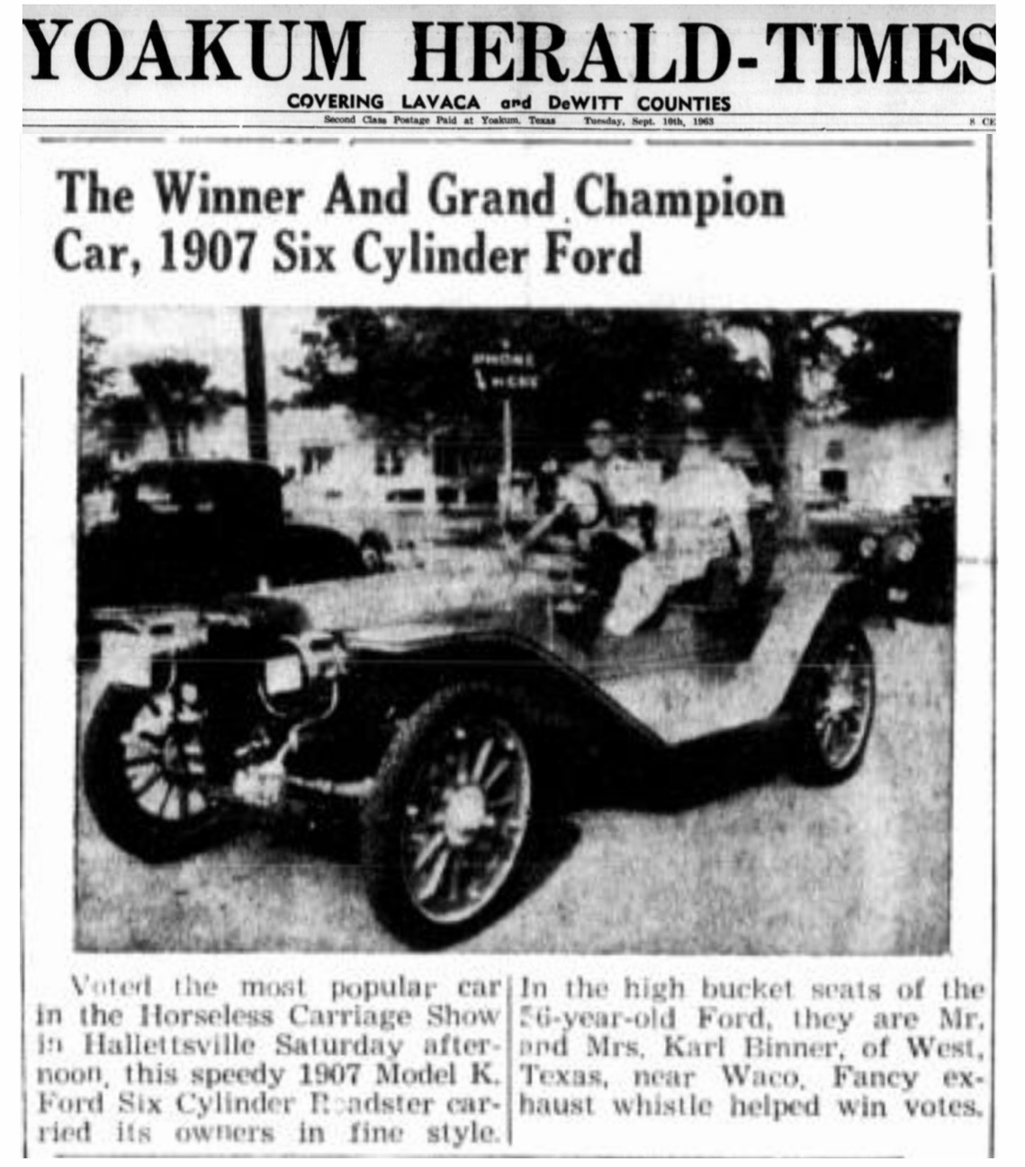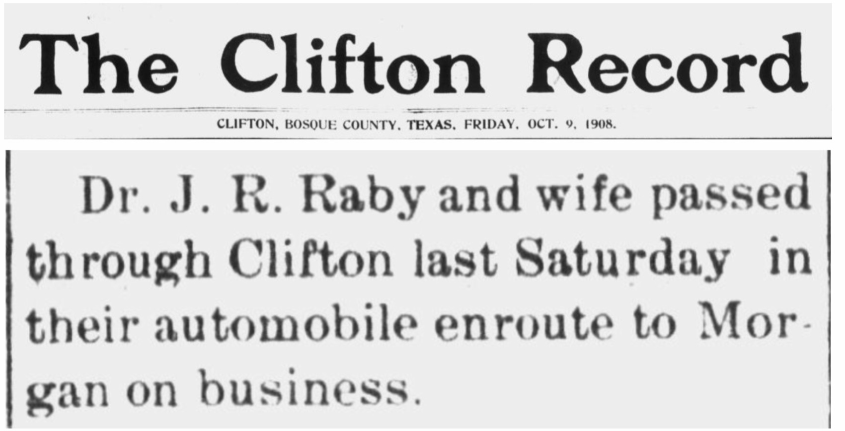 The article below mentions Dr. Raby and wife passing through Clifton TX in their automobile. I have no idea if this was the Raby K, or a car he owned prior or while he owned his “Ford Six.”