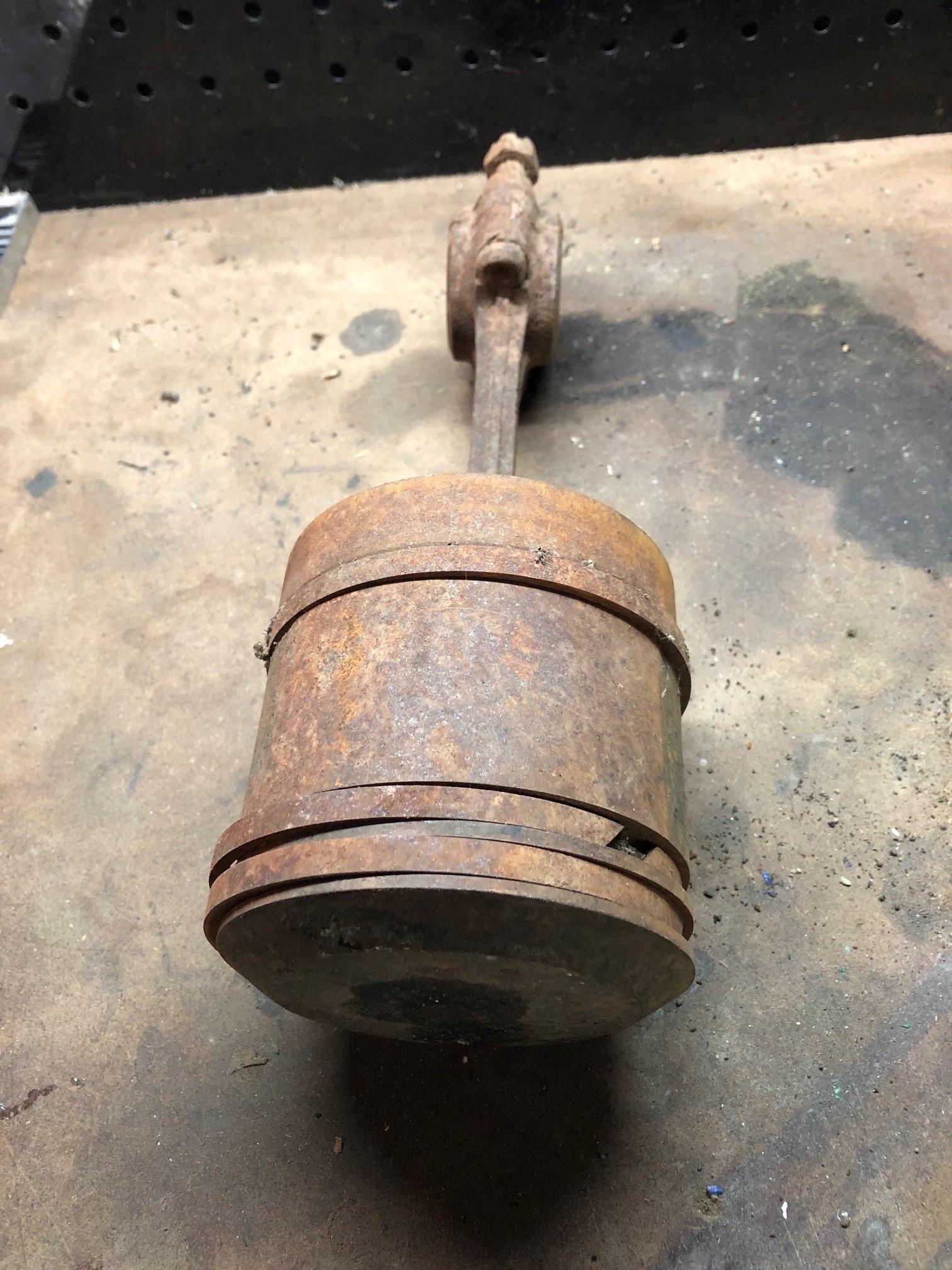 This piston came out of an engine that was sitting in a salt shed for salting meat. The whole engine is frozen solid. Before soaking for 4 days the wrist pin would not turn and the rings were frozen in their grooves. After treatment the wrist pin can move and the rings are free. The treatment leaves a fine black powder deposit on everything that can be removed with soap and water and some scrubbing. The black deposit is on the babbitt too so it is hard to tell if the babbitt was eroded but it looks like it has not been greatly effected. It was in very bad shape before the treatment. I tried to take the cap off by beating on the bolts but it is not moving. I will have to drill out the bolts. I have no intention of using these parts, it was an experiment to see if the Evapo-rust could treat these parts.
