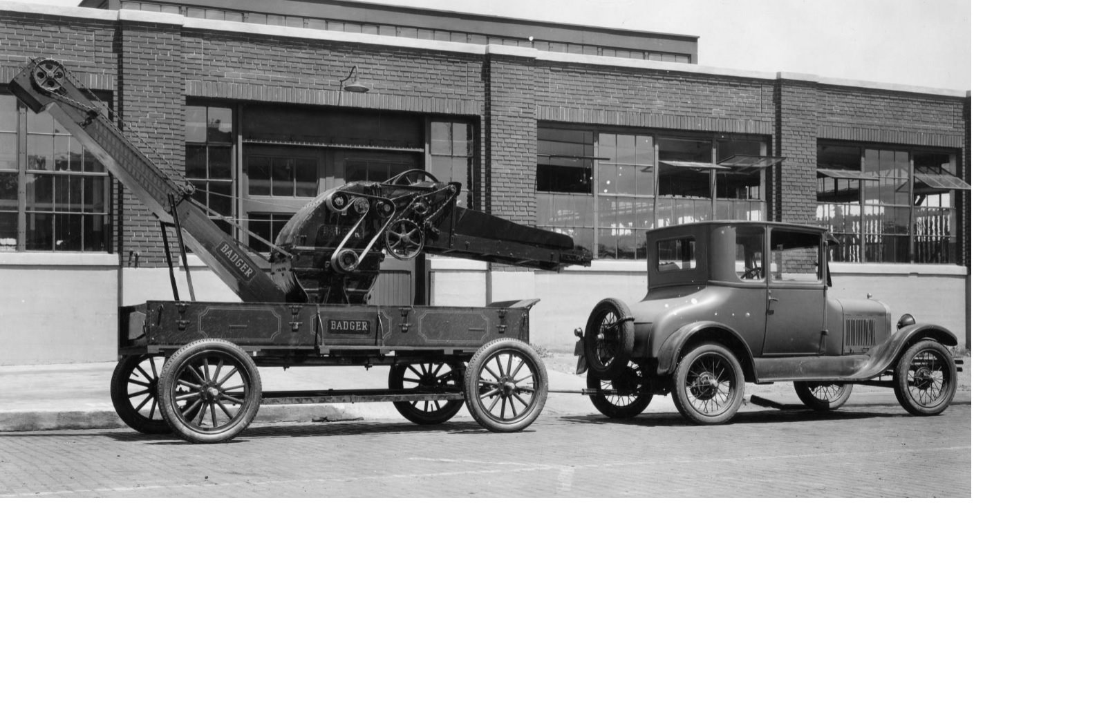 Mark: My Model A buddy found this link giving more history of the Badger Company. From the old photos and advertising on the buildings, it appears they were significantly involved with Ford vehicles early on. I suspect the hitch is their doing, and aren't those model T wheels on the wagon? As for the thresher, the front end looks convincing, but there's no air blast or shaker that commonly is part of a 'thresher'. It is a very cool pic and history, I'm grateful for it appearing here, jb