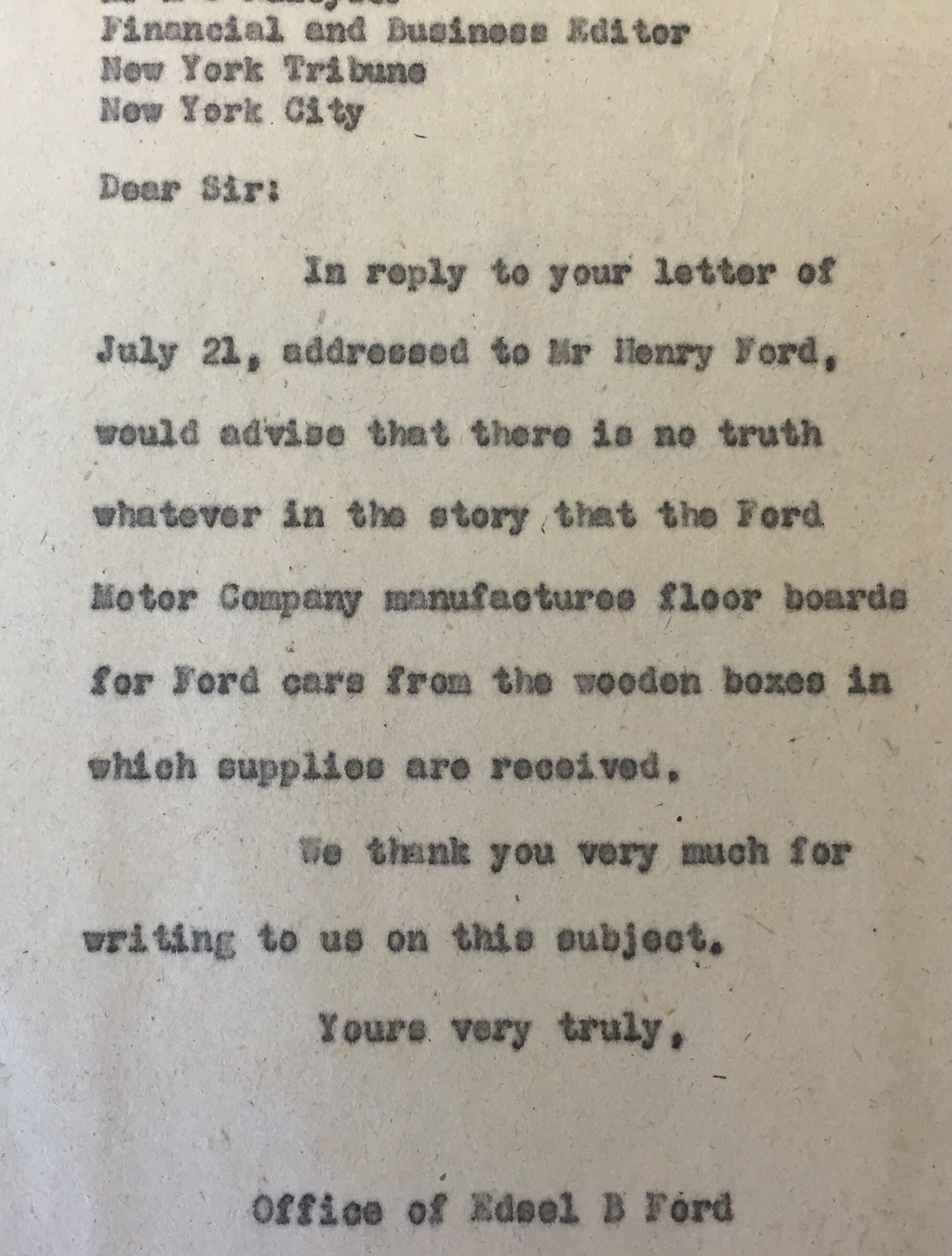 And reply by Edsel Ford, President as to no basis of floor boards made from shipping crates! Myth has lived on since the T was new! (Photos used with permission of The Henry Ford, all rights reserved, for educational use)